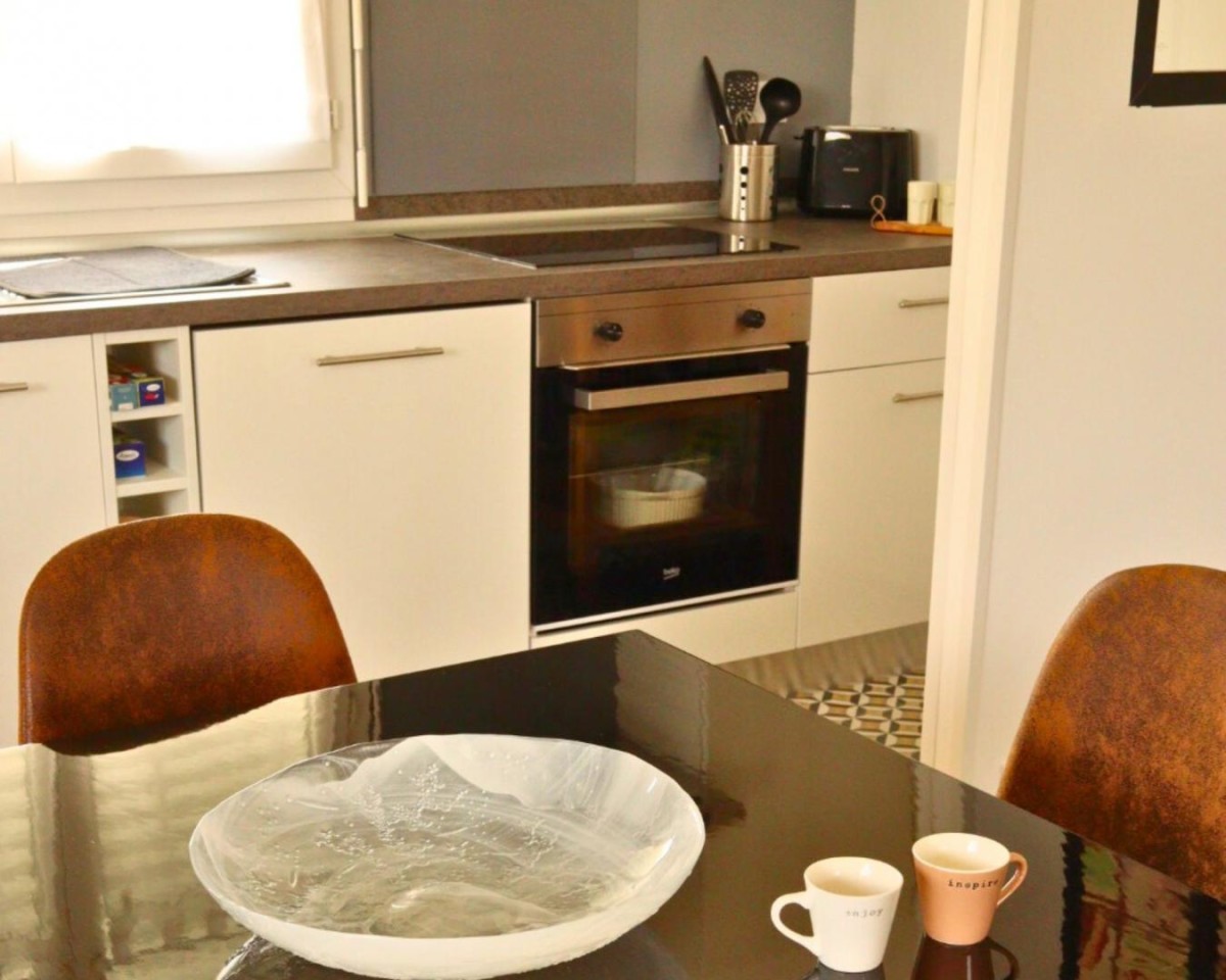 – Un vaste séjour avec cuisine ouverte tout équipée, lave vaisselle four, micro ondes