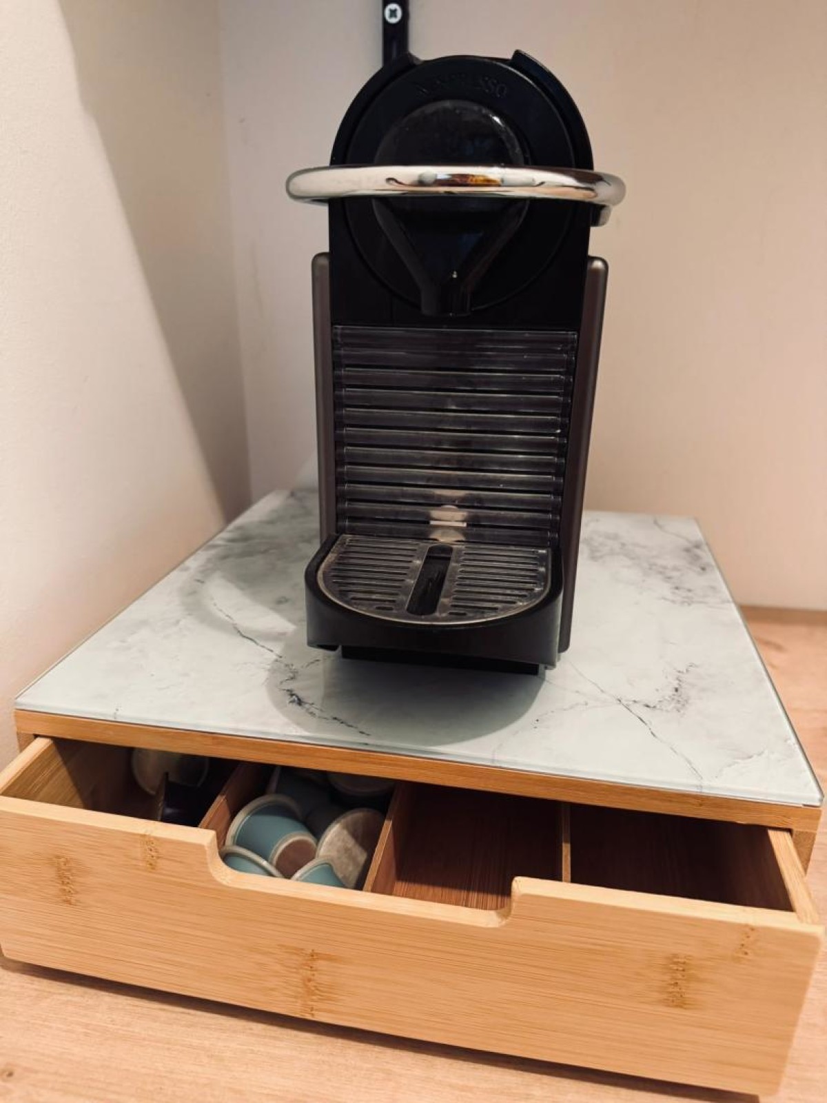 – Une agréable pièce de vie joliment décorée avec un espace salon cosy avec canapés et télévision, une table à manger et un espace cuisine très bien équipée avec four, micro-ondes, réfrigérateur avec compartiment congélateur, lave-vaisselle, machine à café Nespresso et tout le nécessaire de cuisine pour votre séjour ;