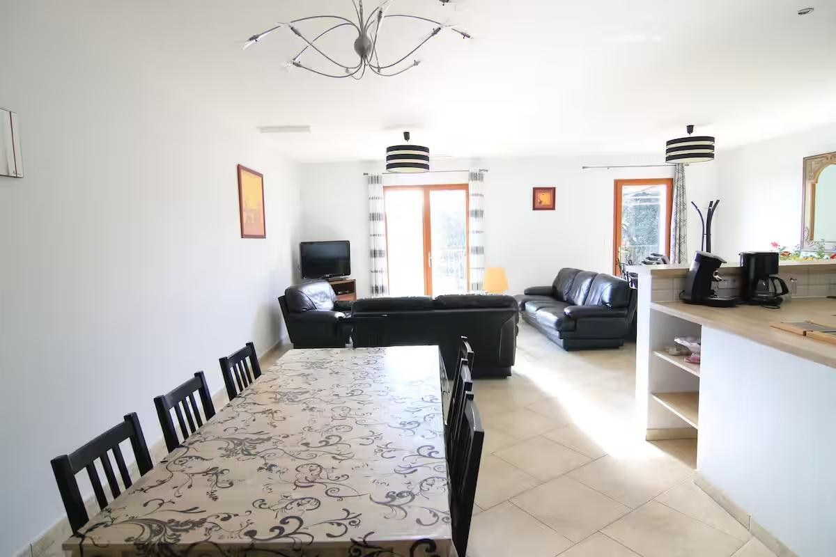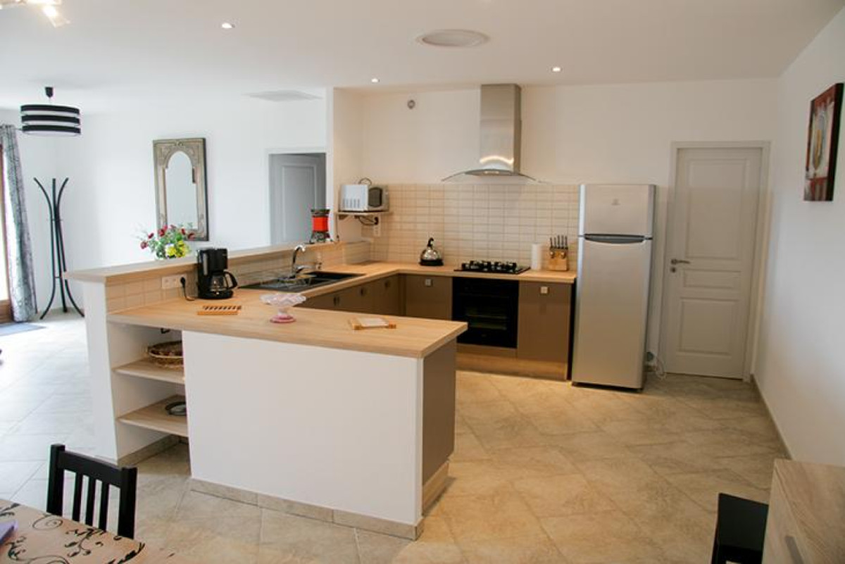 Ce gîte climatisé de 110m², récemment rénové, est accessible par un bel escalier en pierre. Il se compose d’une grande pièce de vie comprenant un salon, un espace repas et une cuisine entièrement équipée (four, micro-ondes, lave-vaisselle, cafetière senseo/à filtre).