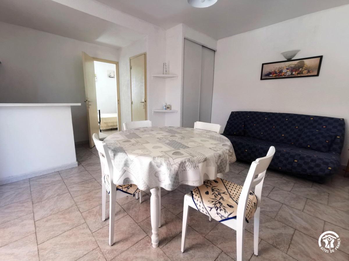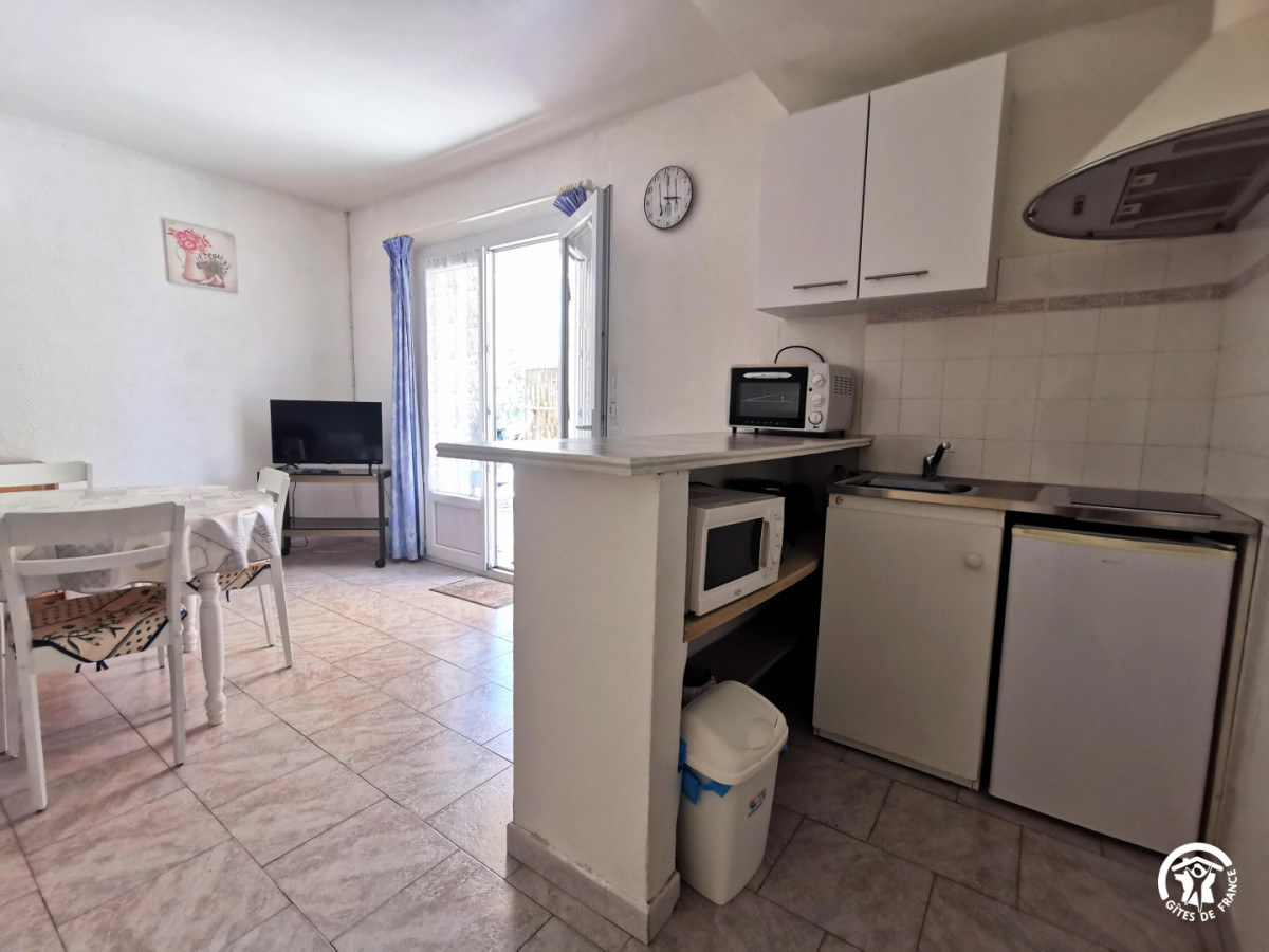 Aménagé de plain-pied, vous y trouverez une pièce à vivre avec la cuisine équipée (frigo, plaques de cuisson, micro-ondes, four..) le coin repas et l’espace salon avec télé et climatisation. Depuis la pièce de vie, vous accèderez à la chambre pour 2 personnes (lit 140×190) et une salle d’eau.