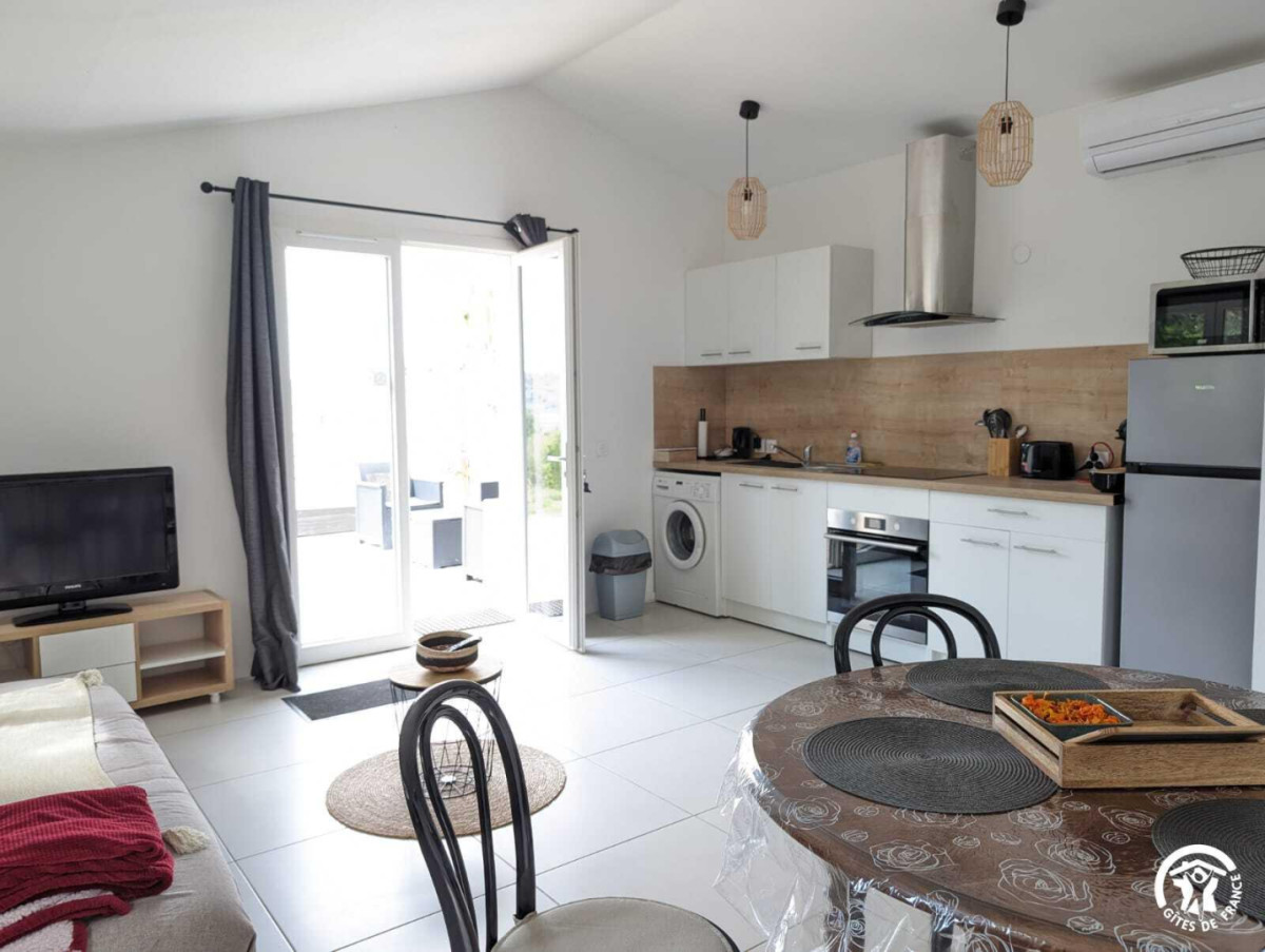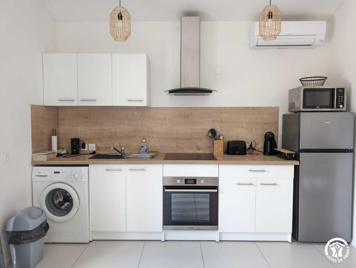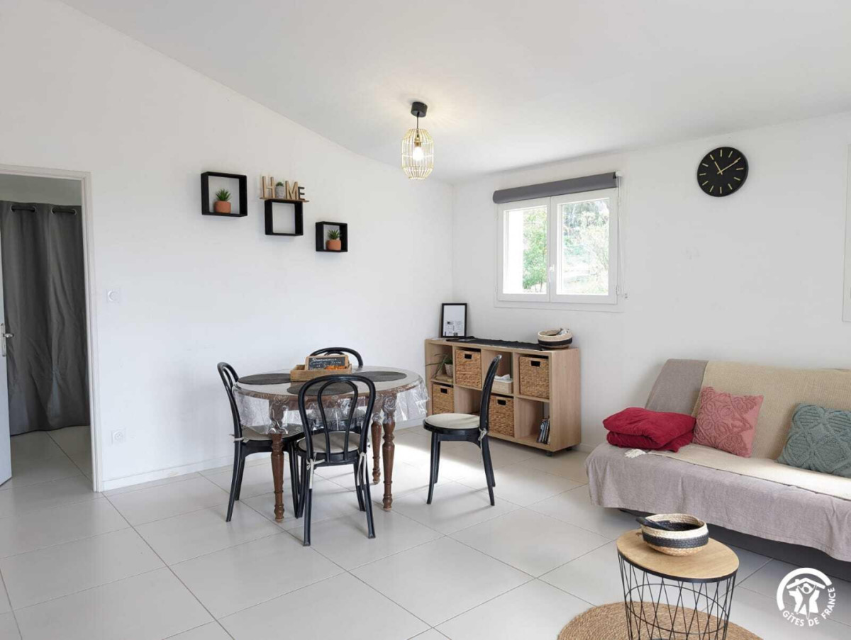 Séjour/cuisine avec canapé, table basse et table à manger, TV, wifi, cuisine équipée : four, four micro-onde, frigo, plaques de cuisson, grille-pain , cafetière classique et Dolce Gusto, machine à laver et tout le nécessaire pour cuisiner.