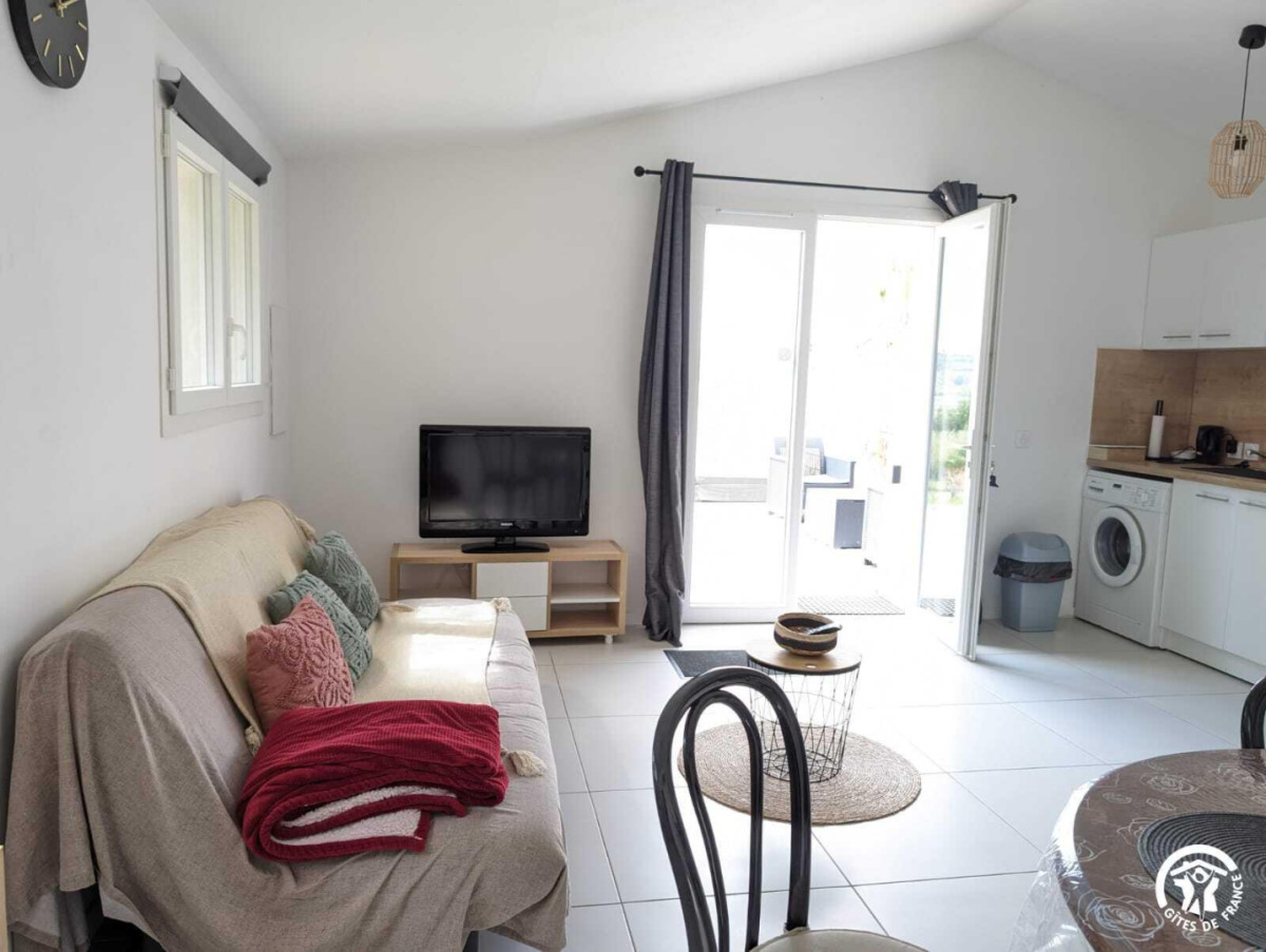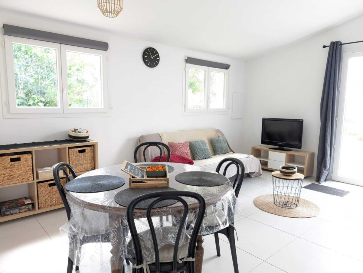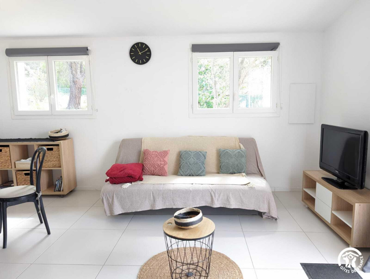 Séjour/cuisine avec canapé, table basse et table à manger, TV, wifi, cuisine équipée : four, four micro-onde, frigo, plaques de cuisson, grille-pain , cafetière classique et Dolce Gusto, machine à laver et tout le nécessaire pour cuisiner.