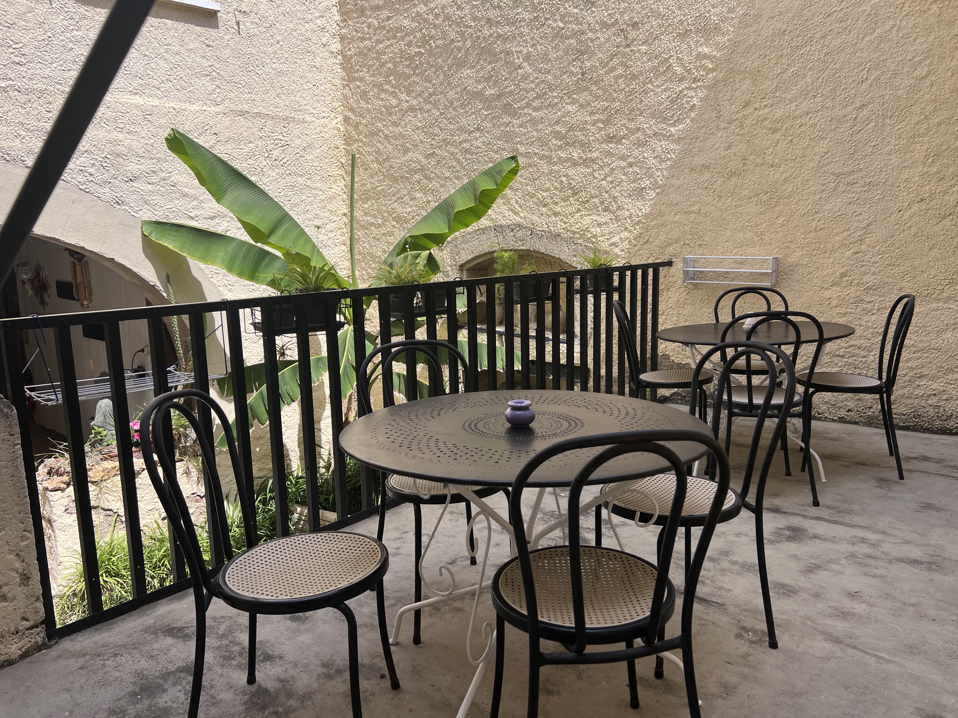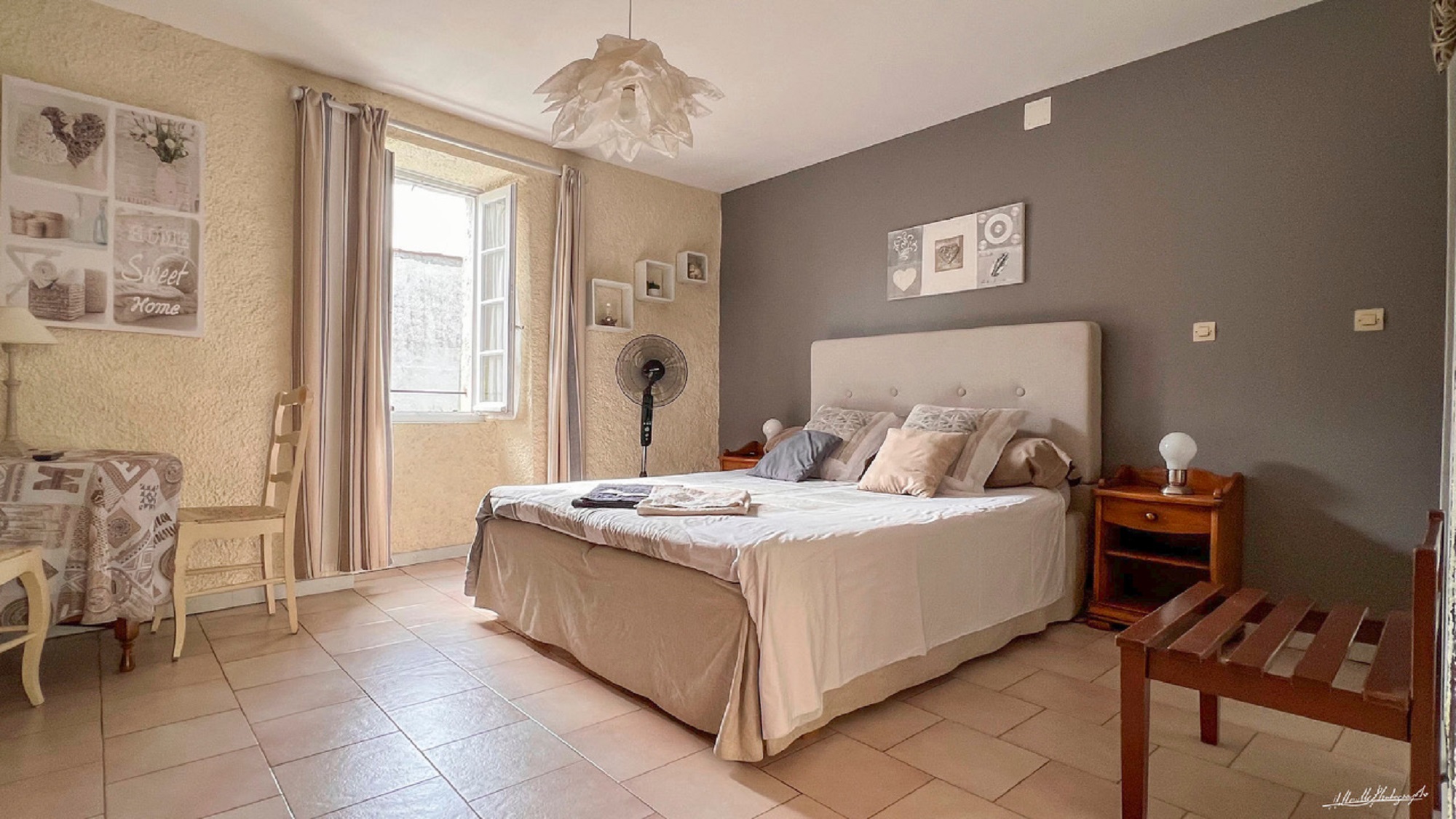 La chambre LUNE DE MIEL au charme d’antan, dispose à l’extérieur d’un coin repas sur le balcon.