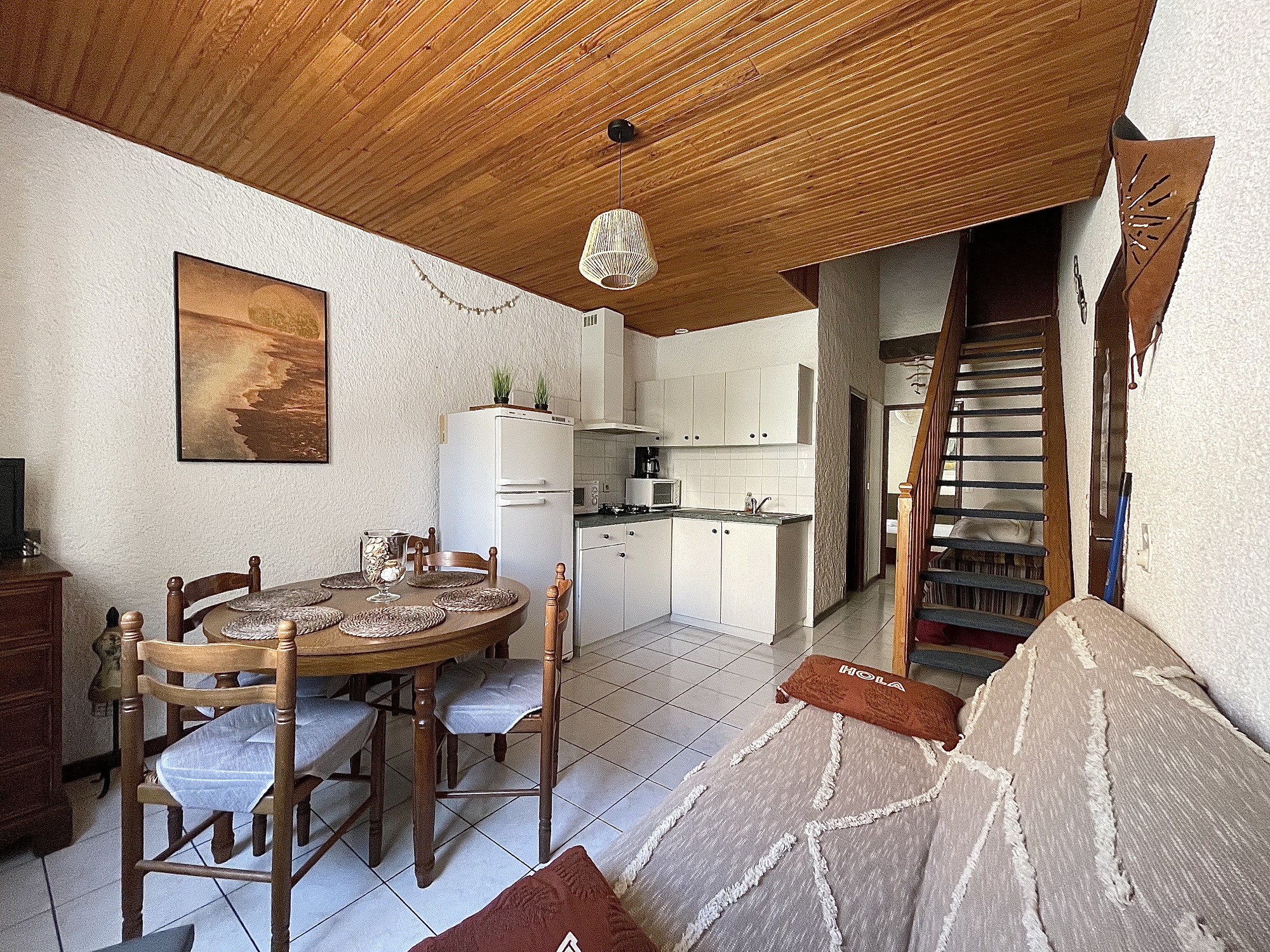 Notre gîte LA CASA DEL SOL, comprend un coin repas, une cuisine équipée comprenant toute la vaisselle nécessaire, un four micro-ondes, une cafetière, une plaque de cuisson à gaz et un frigo.