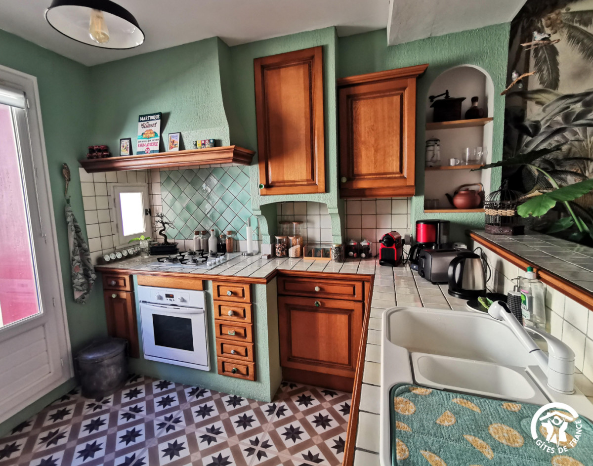 La cuisine entièrement équipée (four, micro-onde, machine à café…) est ouverte sur la salle à manger, permettant ainsi de partager des moments de convivialité autours de la confection d’un bon repas ou d’un petit-déjeuner.