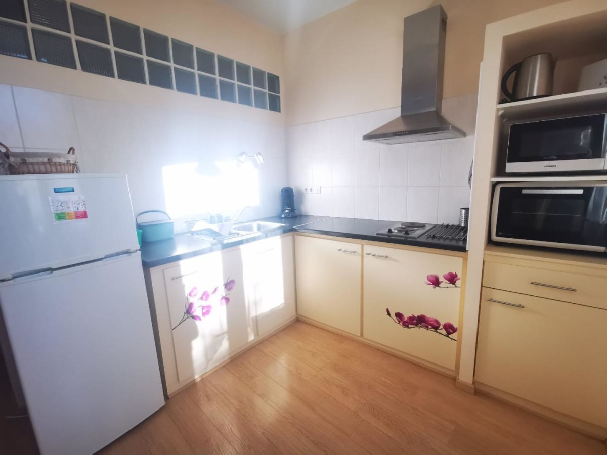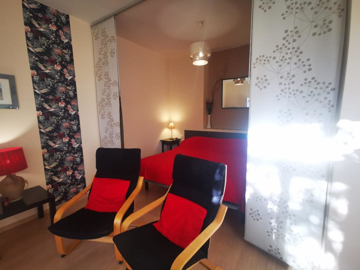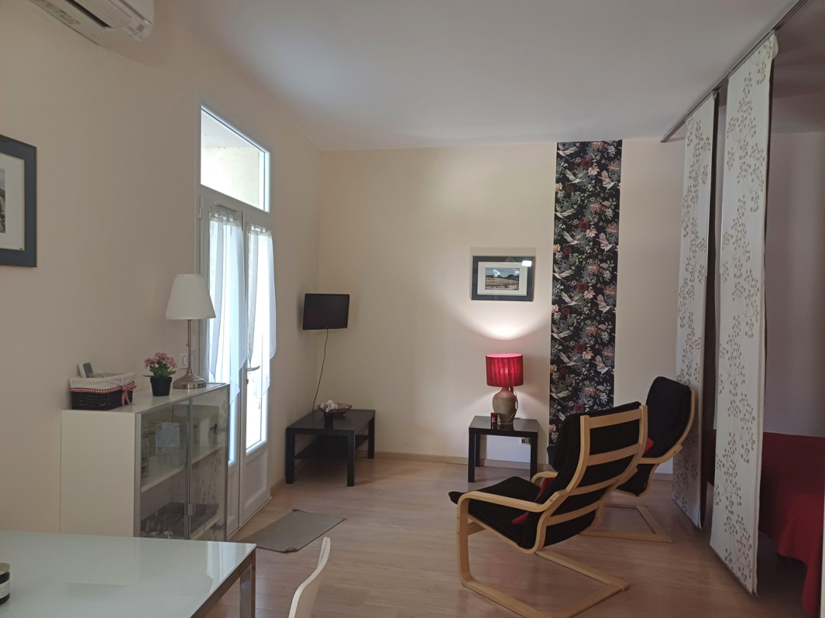 Espace cuisine dans le séjour ; espace nuit (2 lits jumeaux 90×190 cm), salle d’eau/WC. Chauffage/climatisation réversible, draps fournis et lits faits.