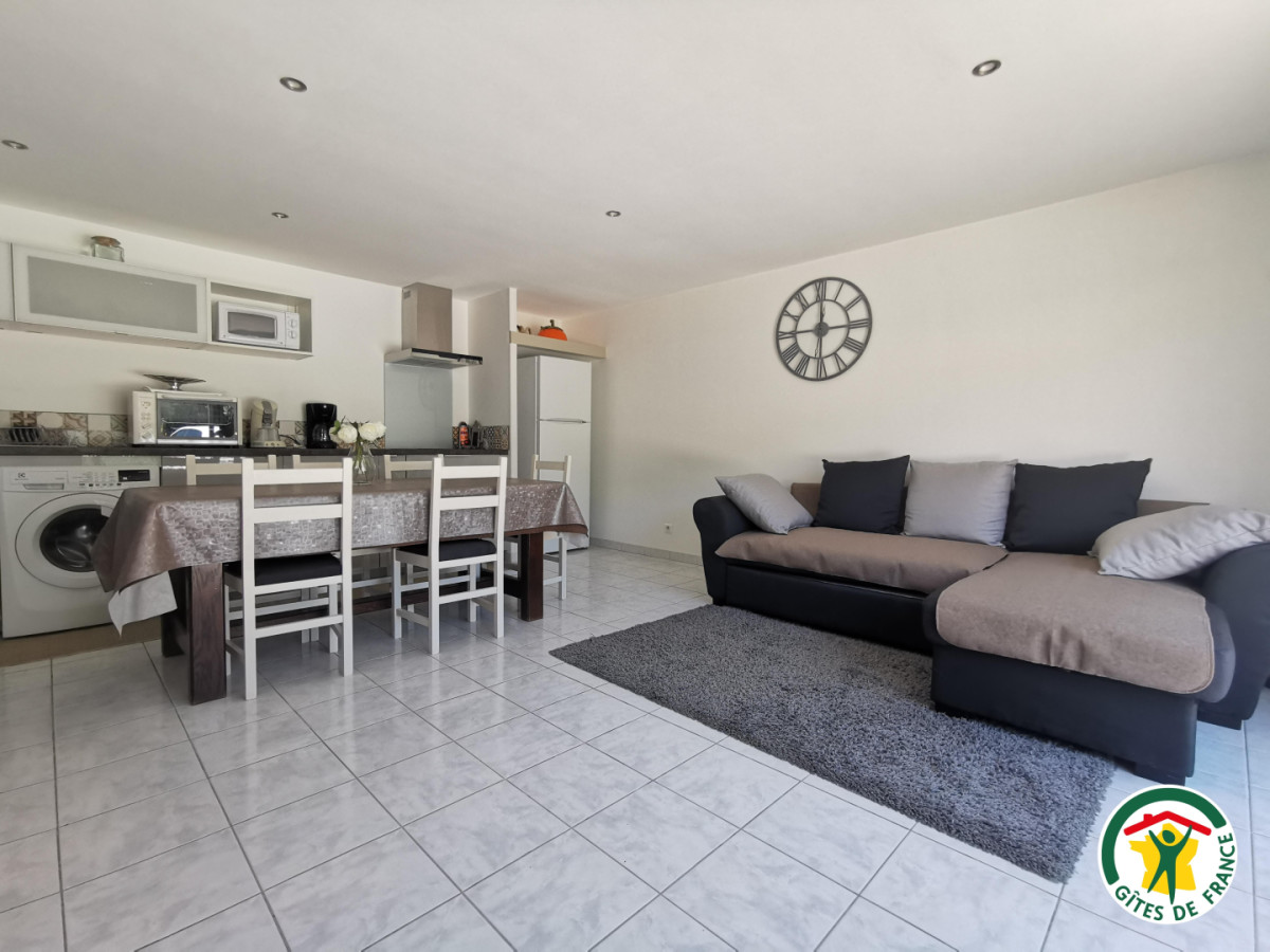 L’hébergement est composé d’une cuisine équipée ouverte sur le salon, où vous disposez d’un canapé confortable, une grande chambre avec un lit 2 places (140X190) et d’un espace nuit avec 2 lits superposés (90×190). Hébergement équipé d’une climatisation réversible.