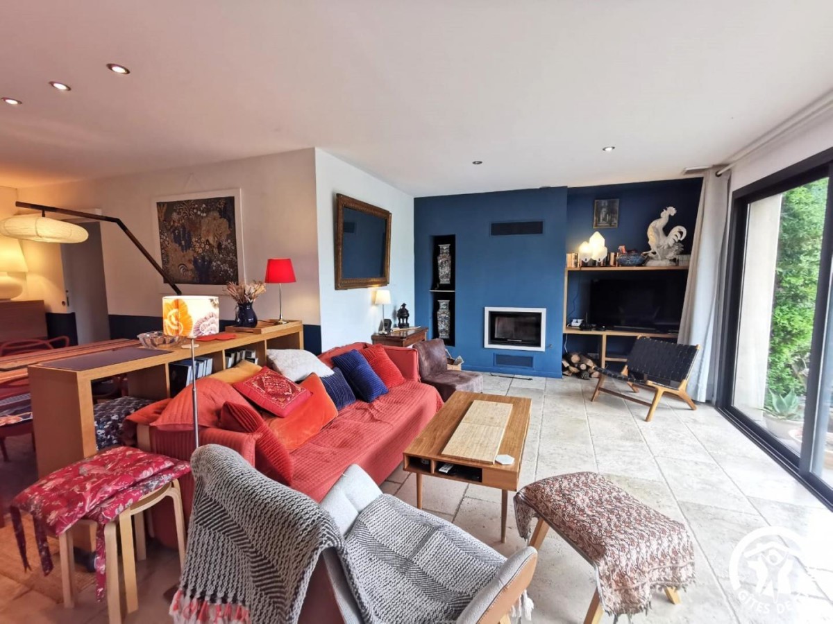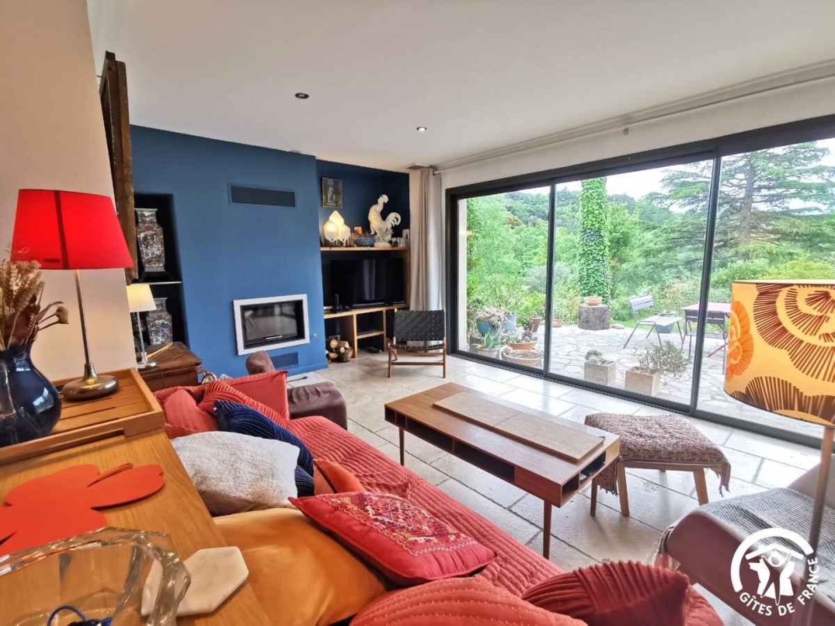 – Une grande pièce de vie joliment décorée avec une table à manger (avec rallonge), un beau salon avec canapé et grands fauteuils, insert de cheminée, télévision, lecteur DVD, ouvert sur de grandes baies vitrées offrant une vue imprenable sur le jardin et les collines alentour.