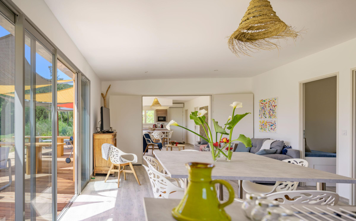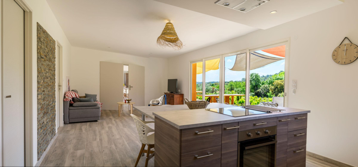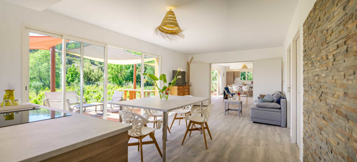 Le gîte, de plain-pied et climatisé, propose deux cuisines ouvertes entièrement équipées (four pyrolyse, lave-vaisselle, micro-ondes, vaisselle complète), idéales pour préparer de bons repas en famille ou entre amis. Deux salles à manger avec grandes tables permettent de partager des moments conviviaux. Les salon, spacieux et lumineux, invitent à la détente après une journée d’exploration. Côté nuit, l’hébergement dispose de quatre chambres modulables, parfaites pour accueillir jusqu’à 10 personnes :
