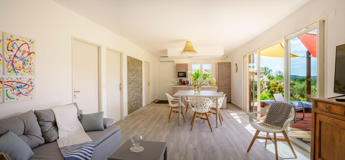 Ce gîte rural mitoyen, climatisé et entièrement de plain-pied, accueille confortablement jusqu’à 4 personnes. L’espace de vie se compose d’une cuisine ouverte moderne et fonctionnelle (four pyrolyse, lave-vaisselle, micro-ondes, cafetières filtre et Nespresso), d’une salle à manger avec grande table et d’un salon lumineux équipé d’un canapé convertible et d’une télévision et de WC indépendant.