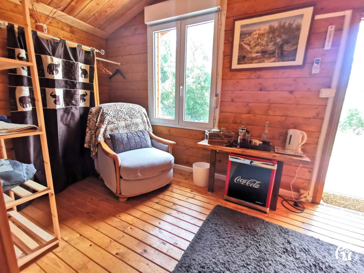 La chambre CHALET est à part : pas de connexion internet ni de télévision mais une situation idéale en pleine nature à coté de la piscine et réveillée par le chant des oiseaux…une pause dans ce monde trop bruyant.