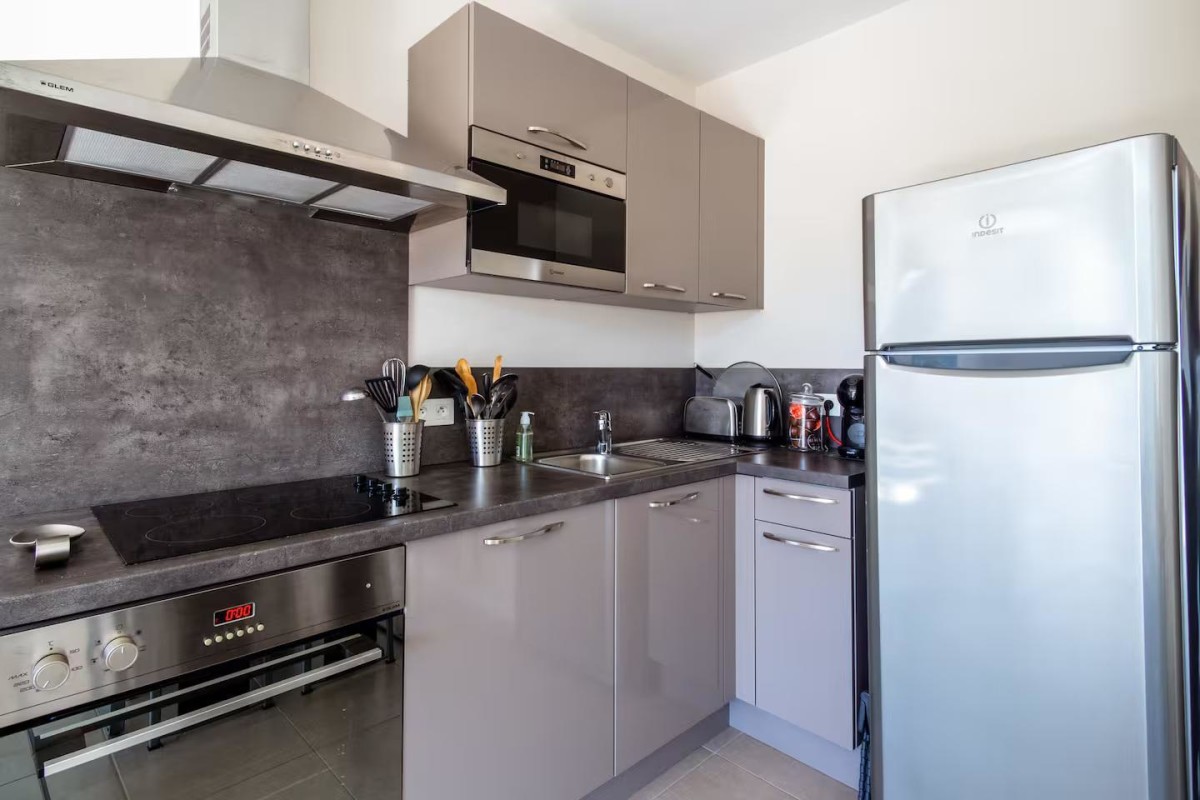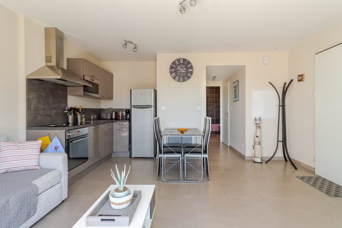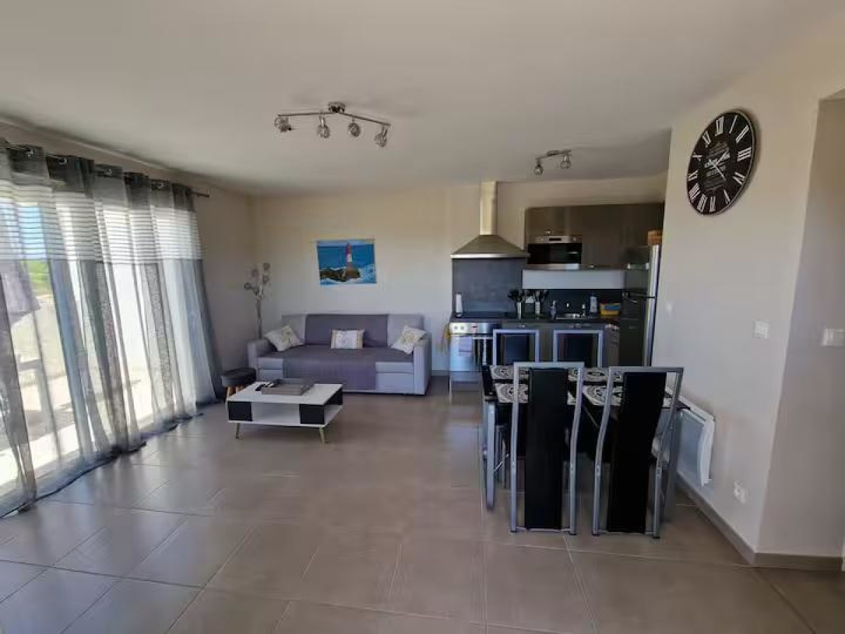 Vous profitez d’une pièce de vie avec cuisine ouverte. La cuisine est parfaitement équipée avec lave-vaisselle, four traditionnel, four micro-ondes, plaques de cuisson, réfrigérateur et cafetière Dolce Gusto, . Vous trouverez ensuite une table à manger et des chaises pour vos repas en famille ainsi qu’un canapé dépliable en véritable lit pour 2 couchage, une table basse et une télévision.