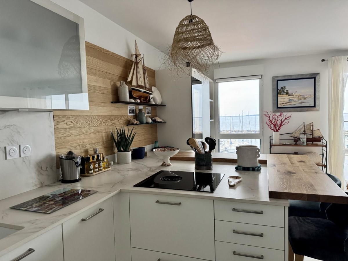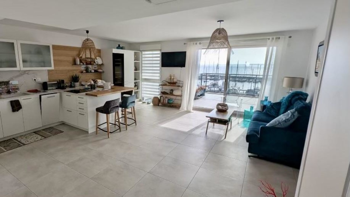 L’appartement, conçu pour deux personnes, propose un bel espace de vie moderne, dans l’ambiance bord de mer. La pièce principale rassemble un salon confortable avec télévision, une cuisine ouverte entièrement équipée (four, micro-ondes, deux fours, réfrigérateur, congélateur, lave-vaisselle, bouilloire, machine à café) et un coin repas, l’ensemble ouvrant sur la terrasse offrant une superbe vue sur le port et l’étang de Thau.