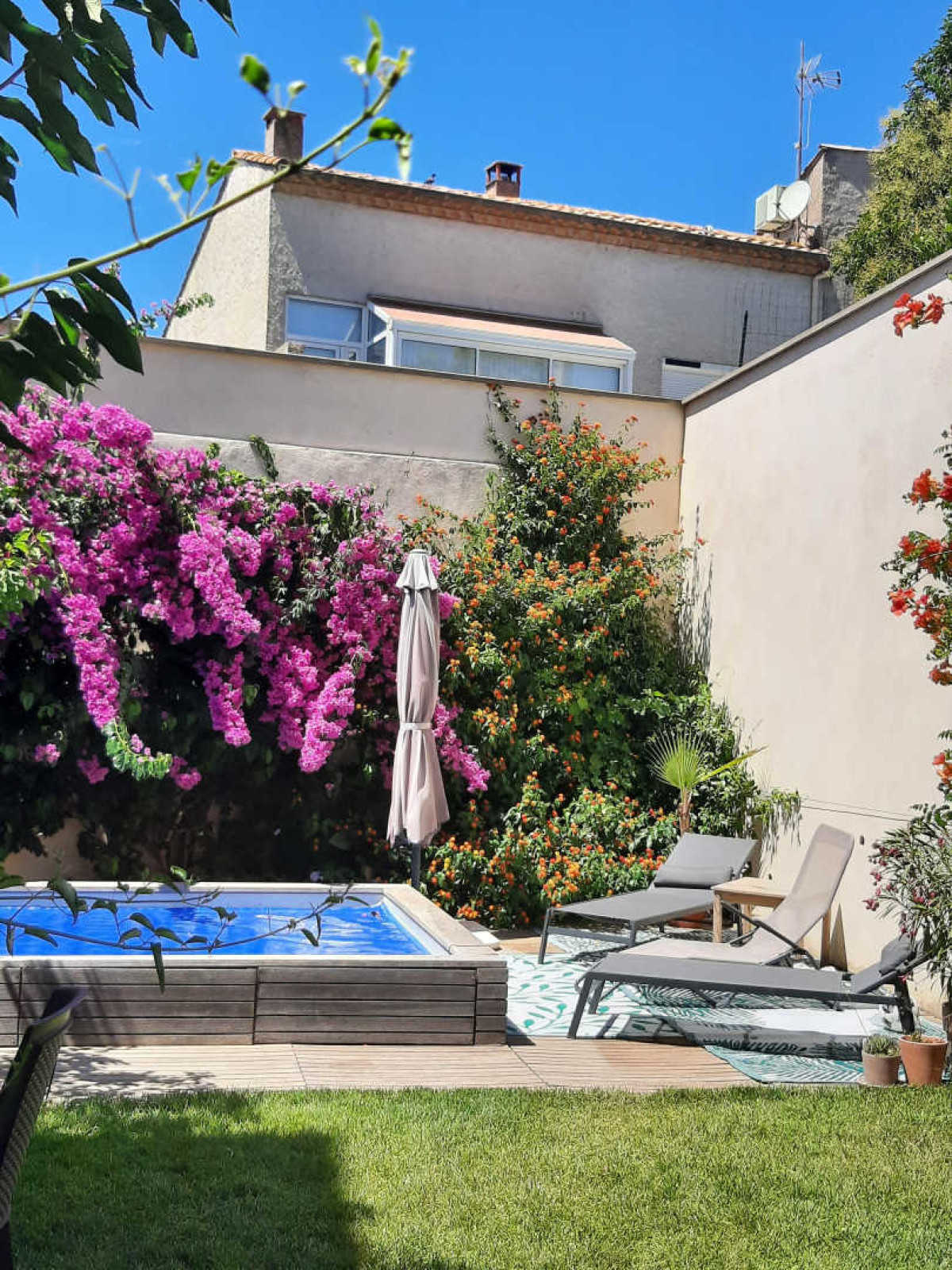 Un jardin avec piscine, commun avec les propriétaires, avec meubles de jardin, transats et barbecue. La piscine est accessible de juin à octobre de 10h à 12h et de 15h à 18h.