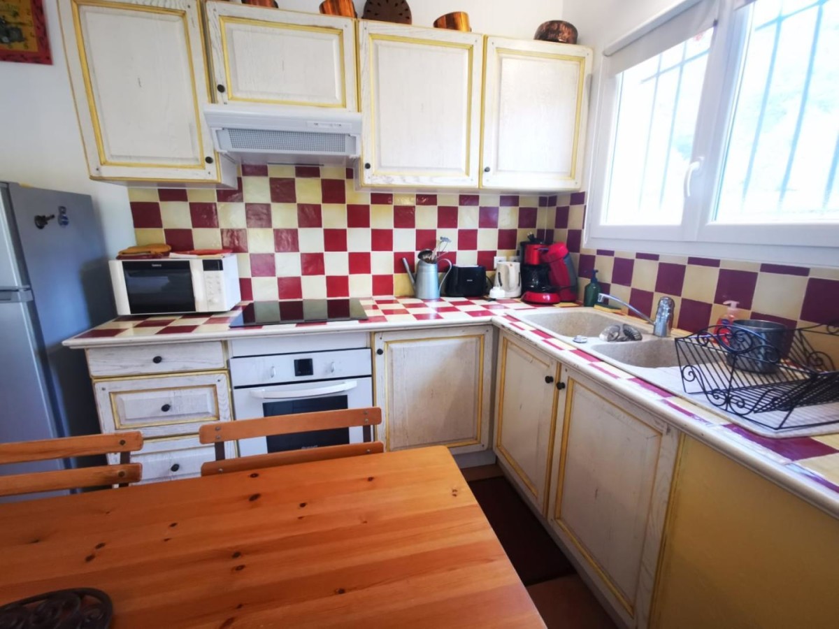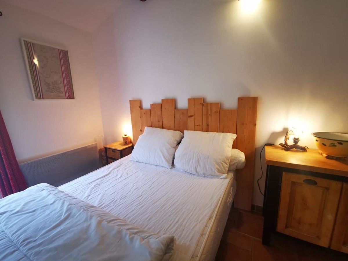 Ce gîte de plain-pied, conçu pour deux personnes, propose une ambiance traditionnelle et chaleureuse. La pièce principale regroupe un espace nuit avec un lit double (140×190 cm), un coin salon avec canapé et télévision, une salle à manger et une cuisine ouverte bien équipée (four, micro-ondes, réfrigérateur, congélateur, cafetière à filtre et à dosettes). La salle d’eau comprend une douche, une vasque avec miroir, des WC et une machine à laver. Le logement est climatisé pour votre confort en toute saison.