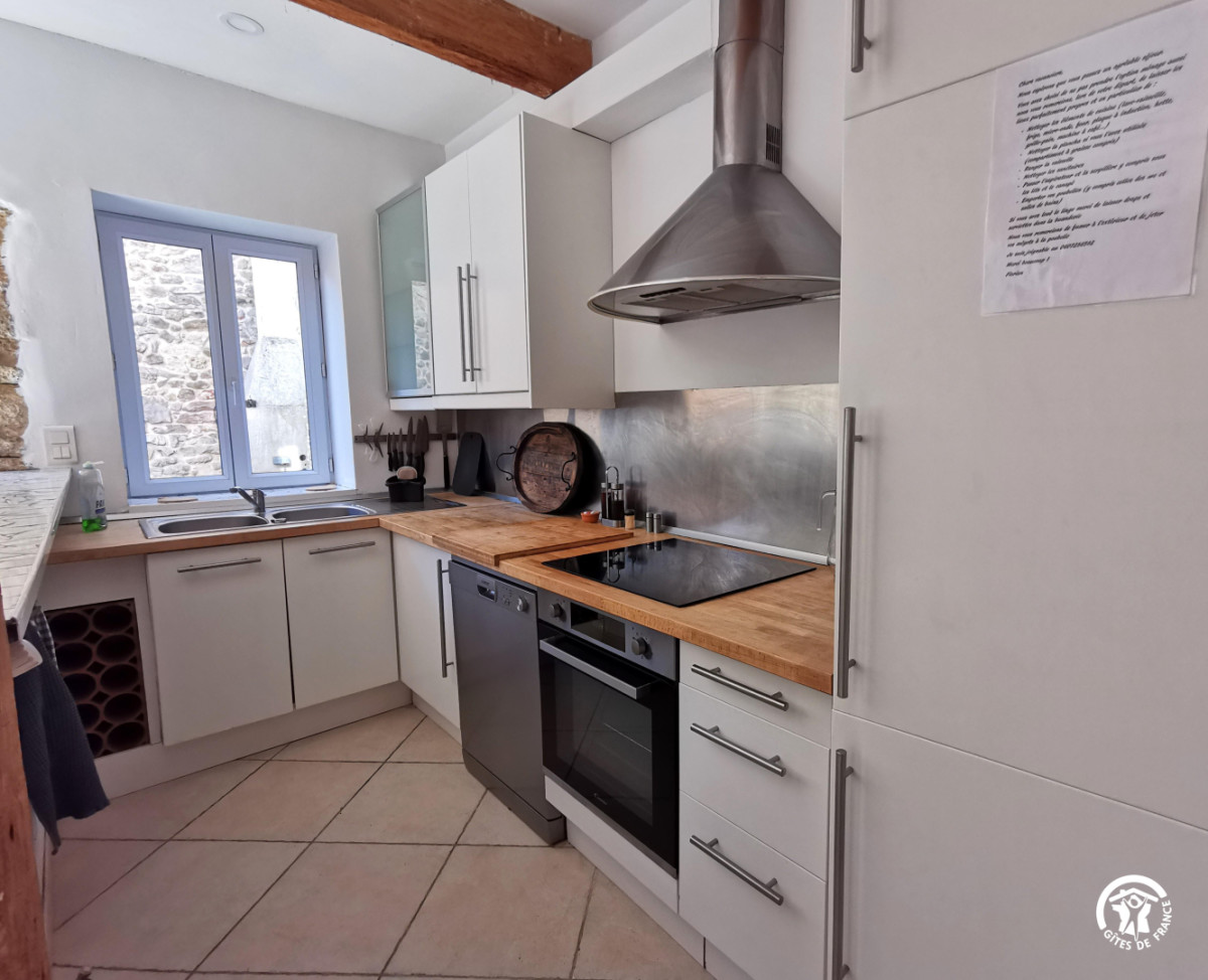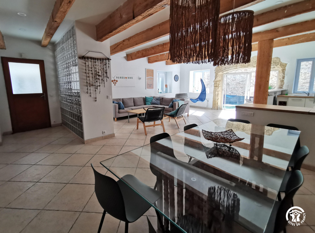 La grande pièce à vivre est divisée en plusieurs espaces ouverts : une cuisine entièrement équipée (four, micro-ondes, lave-vaisselle, réfrigérateur, congélateur, ustensiles de cuisine), un coin salon/TV, un coin repas avec une jolie table en bois flotté fabriquée par les propriétaires, et un bureau pour travailler confortablement.