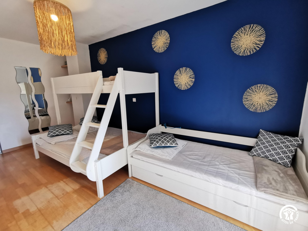 Le coin nuit se trouve à l’étage. Vous y trouverez une première chambre double (lit 140x190cm) avec salle de douche attenante, une deuxième chambre double climatisée (lit 160×200) et une chambre familiale climatisée comprenant un lit double (140x190cm) et deux lits simples (90x190cm). La grande salle de bain est équipée d’une baignoire et d’une douche pour un maximum de confort.