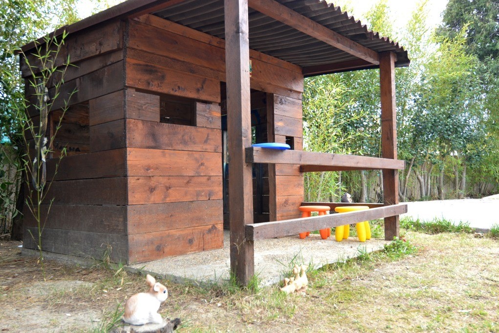 A l’extérieur grand jardin où vous aurez le choix des terrasses. Terrasse couverte, terrasse avec son salon de jardin. Et pour les tout petits …Surprise : une cabane en bois ……