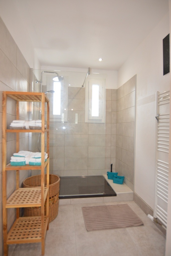 L’espace nuit comprend 3 belles chambres : 2 chambres avec 1 lit en 180 cm (séparable en 2 lits de 90 cm) ,1 chambre avec 2 lits en 90 cm – Une salle d’eau avec sa douche à l’italienne+ 2 vasques. WC séparés. Une buanderie avec sèche-linge –