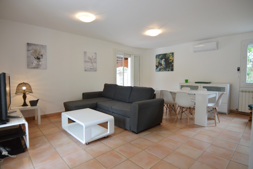 La villa dispose d’un séjour /salon avec TV, canapé convertible et un coin repas, le tout donnant sur le jardin. La cuisine séparée est entièrement équipée (combiné frigo/congélateur, four, micro-ondes, lave-vaisselle, lave-linge, cafetière électrique).