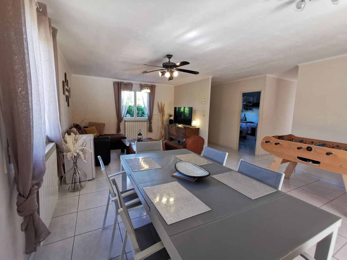 Cet hébergement de plain-pied en rez-de-chaussée comprend une cuisine parfaitement équipée (cafetière traditionnelle et machine nespresso, bouilloire, grille-pain, micro-ondes, four, lave-vaisselle, réfrégérateur combiné), une salle à manger avec une enceinte radio chaîne hifi, un lecteur DVD et films vidéos, livres et babyfoot.