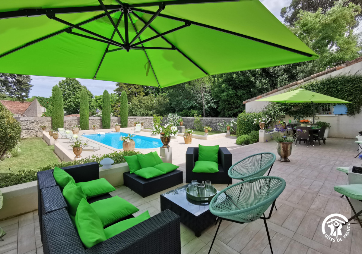Entourée d’un jardin paysager à l’inspiration toscane, alimenté par un puits du XIIIe siècle, la Villa Ricôme offre un cadre enchanteur propice à la détente. Sa grande piscine privée (10x4m), bordée de transats, ainsi que son pool house avec douche et WC extérieurs, vous garantissent des journées baignées de soleil dans un confort absolu.