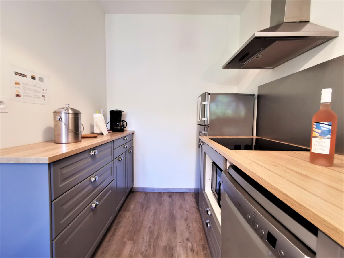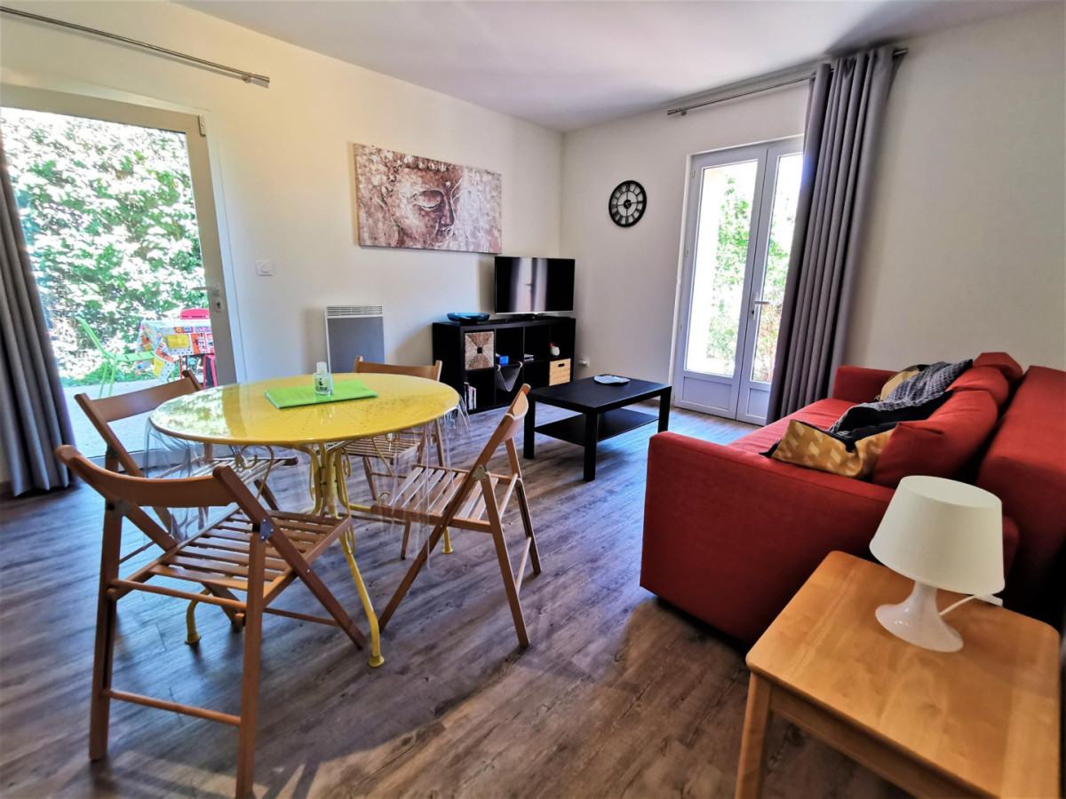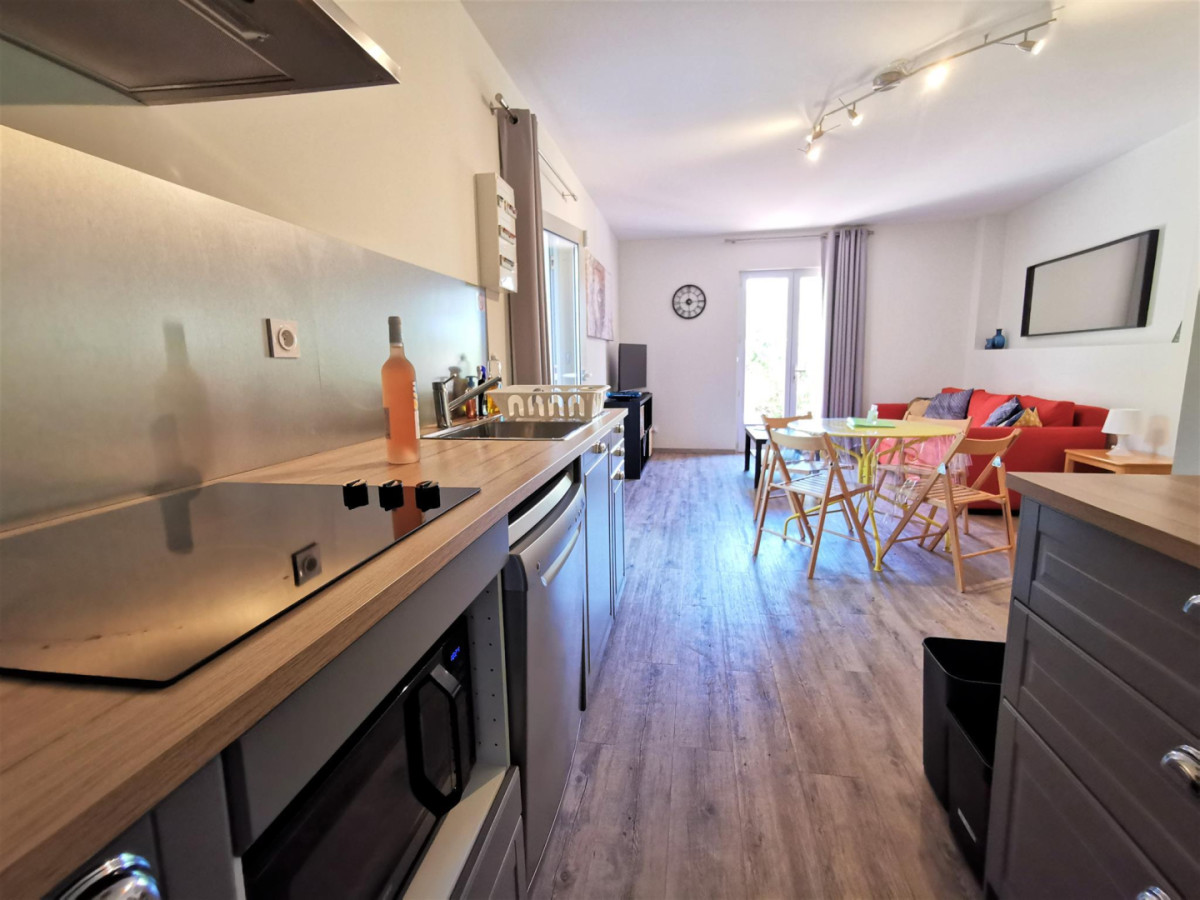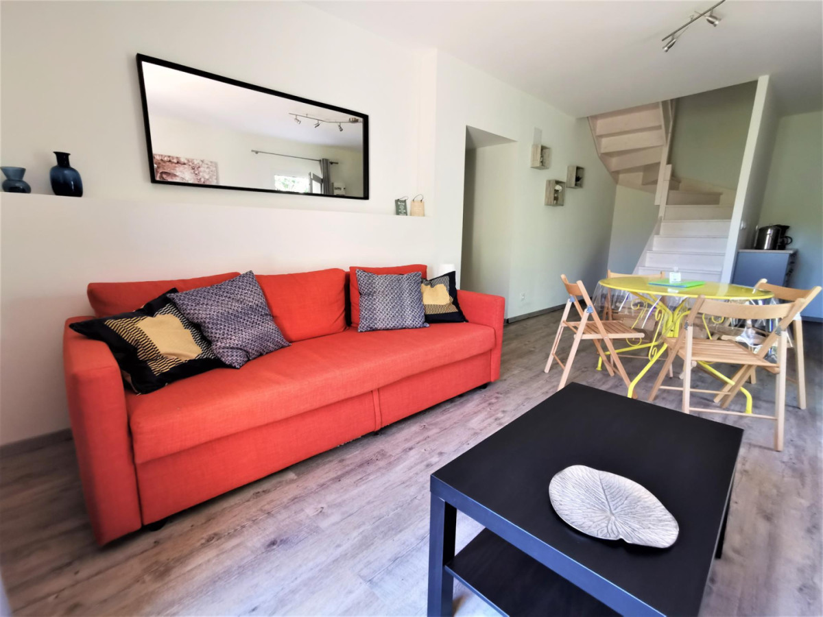 Au rez de chaussée, la pièce à vivre forme un espace convivial ouvert sur une cuisine entièrement équipée.