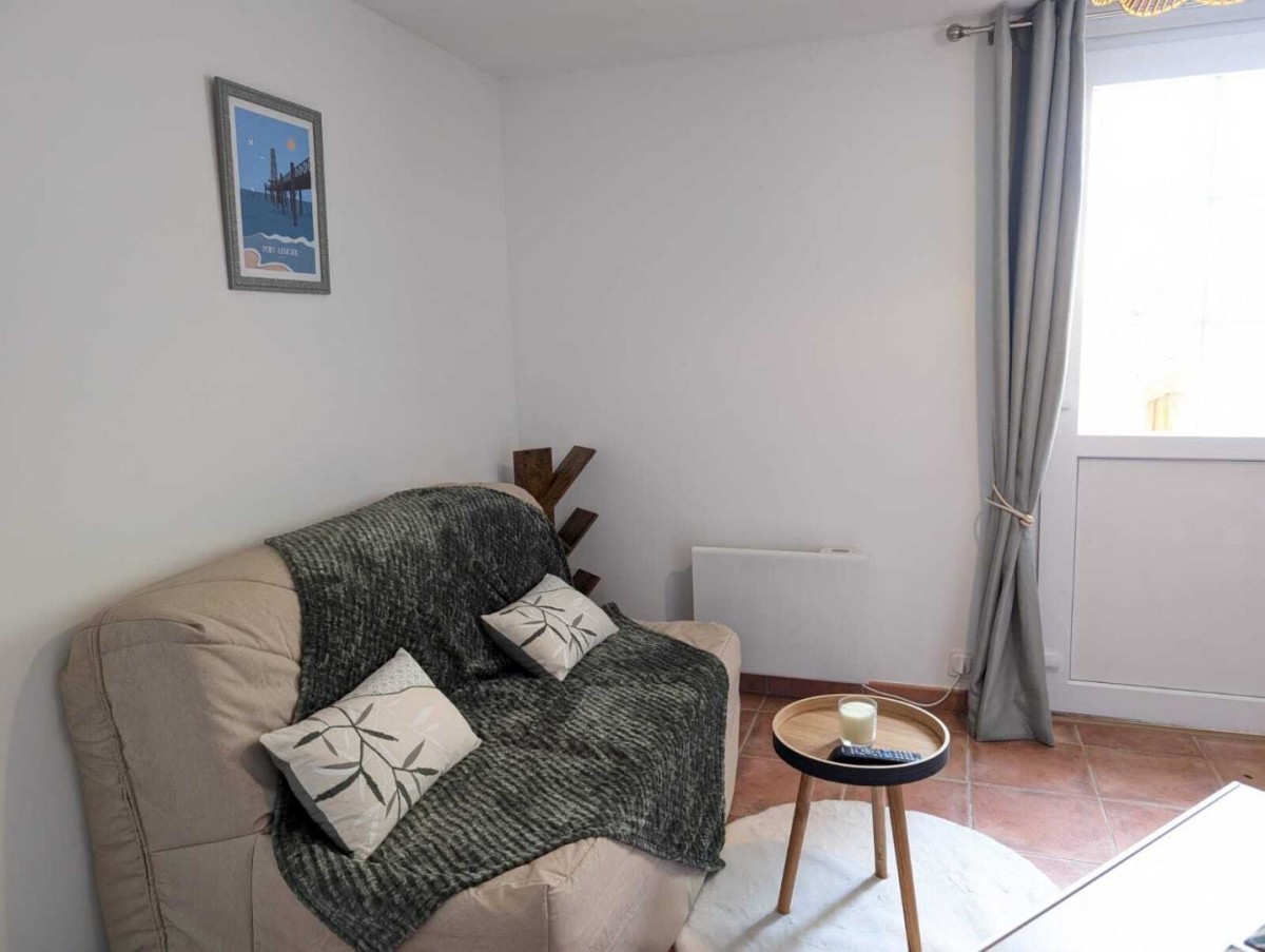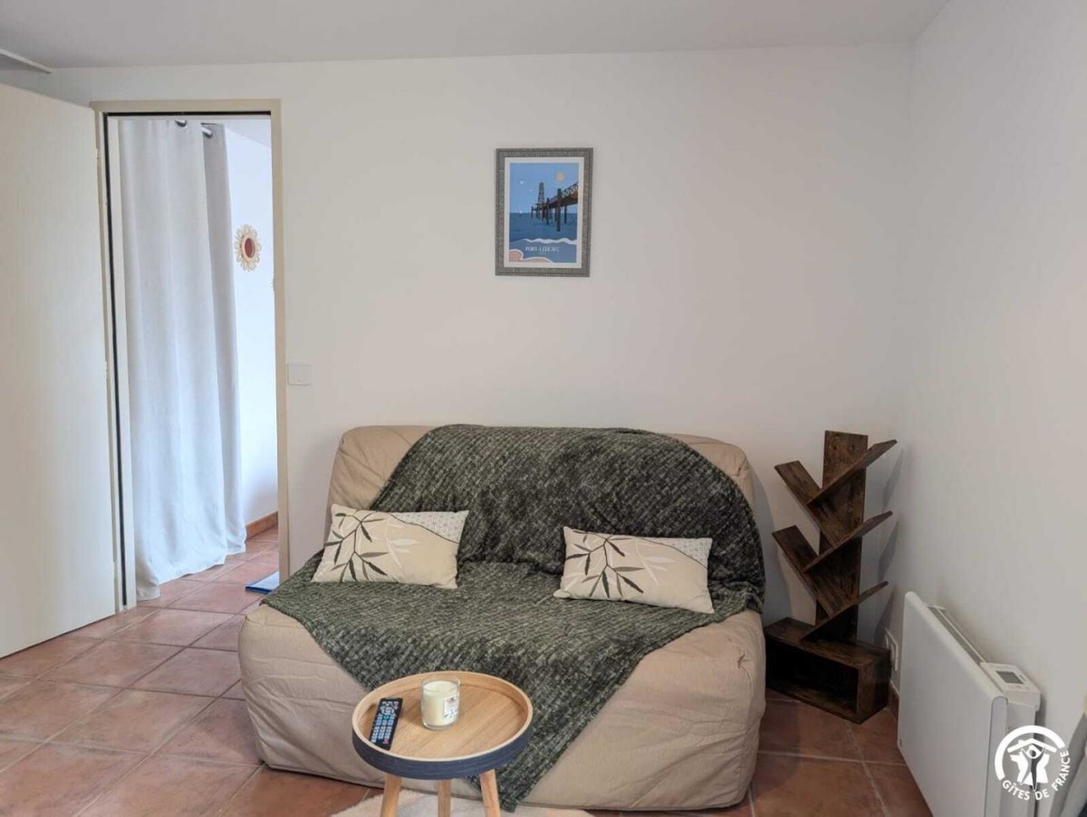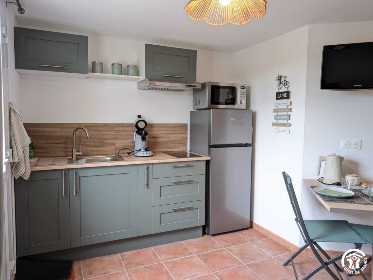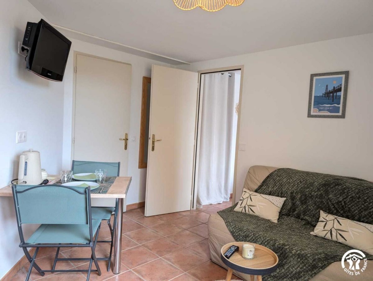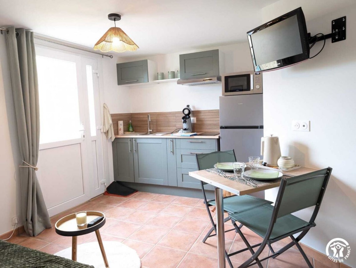 – Un séjour avec cuisine ouverte tout équipée ( Cafetière Senseo, four combiné, 2 plaques de cuisson, etc.), un canapé convertible, table et chaises , télévision.