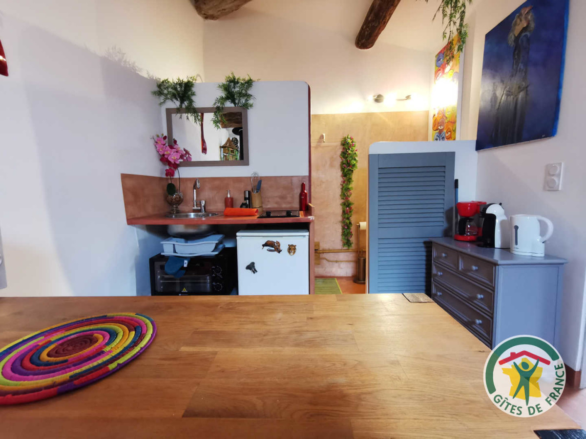 – Pièce de vie lumineuse avec coin cuisine équipée (four-grill, micro-ondes, réfrigérateur, cafetière filtre, Dolce Gusto et bouilloire électrique).