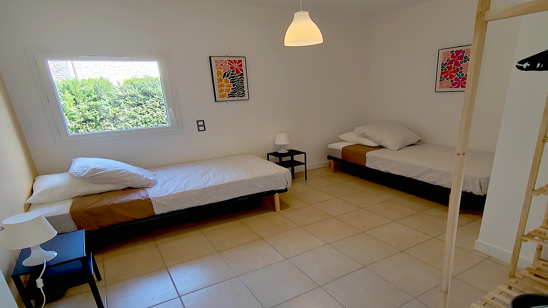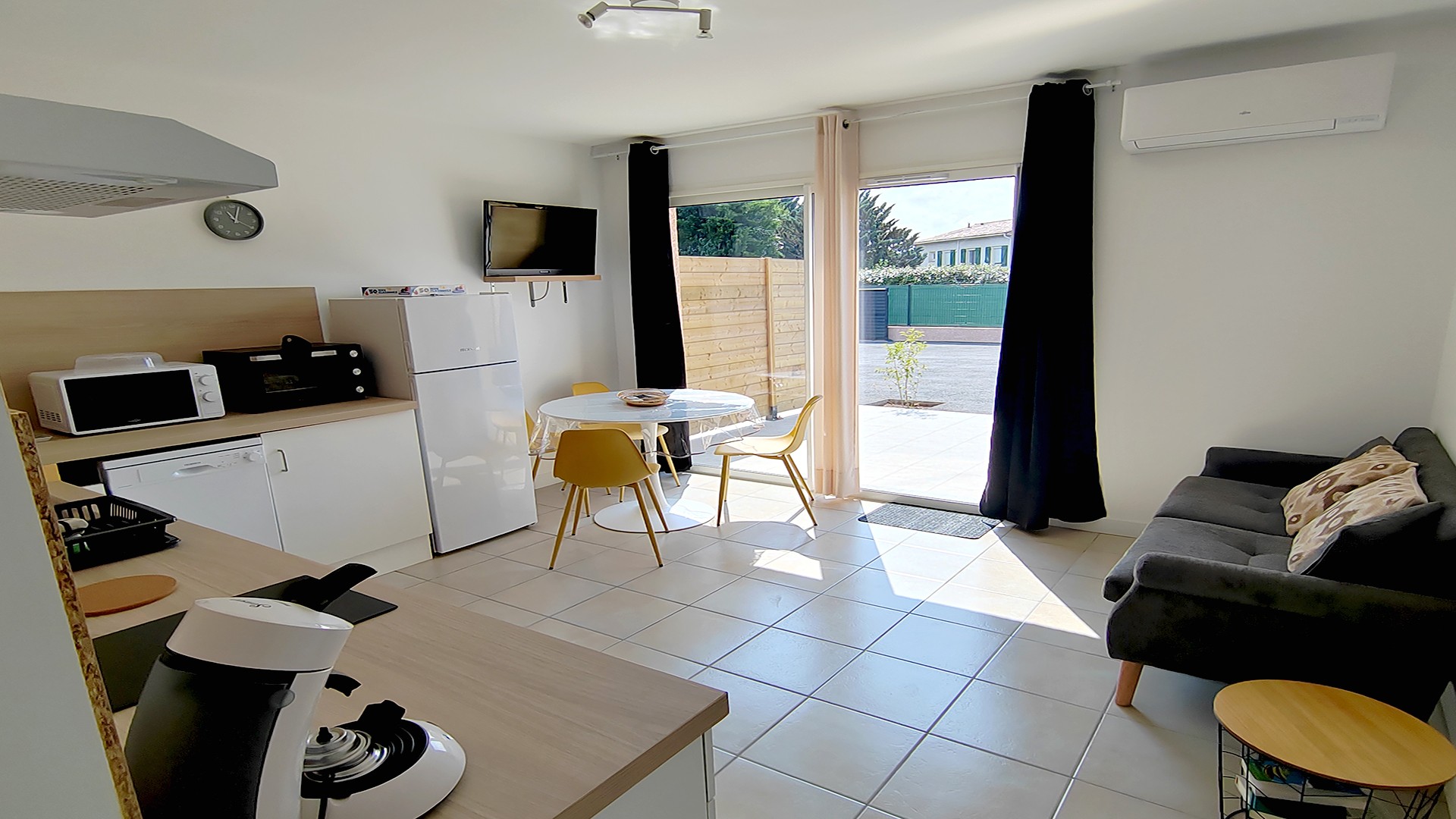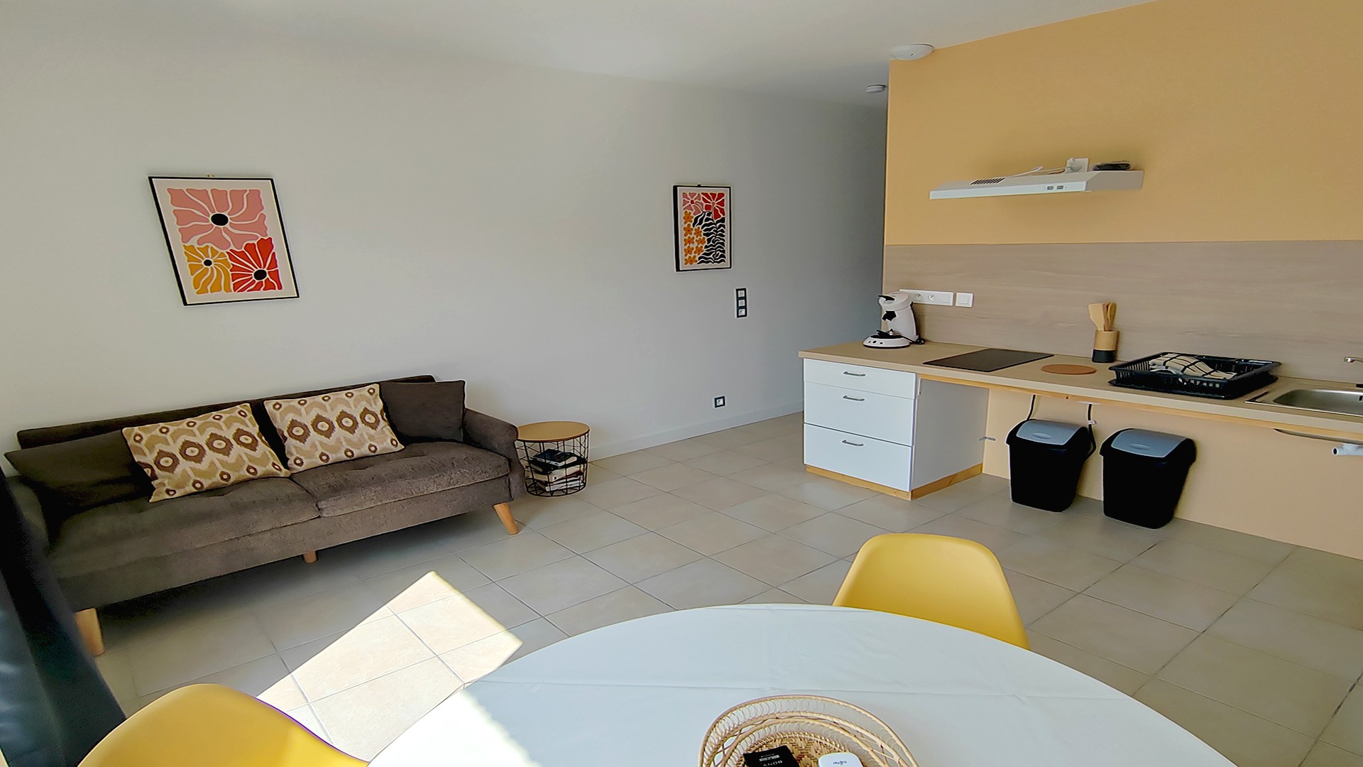 La location saisonnière se compose d’un séjour avec salle-à-manger et télévision, ainsi que d’une cuisine ouverte bien équipée : cafetière Senséo, micro-ondes, réfrigérateur, lave-linge privé, lave-vaisselle, grille pain, bouilloire. Il offre également une chambre indépendante avec deux lits en 90 cm (possibilité de faire un lit double).
