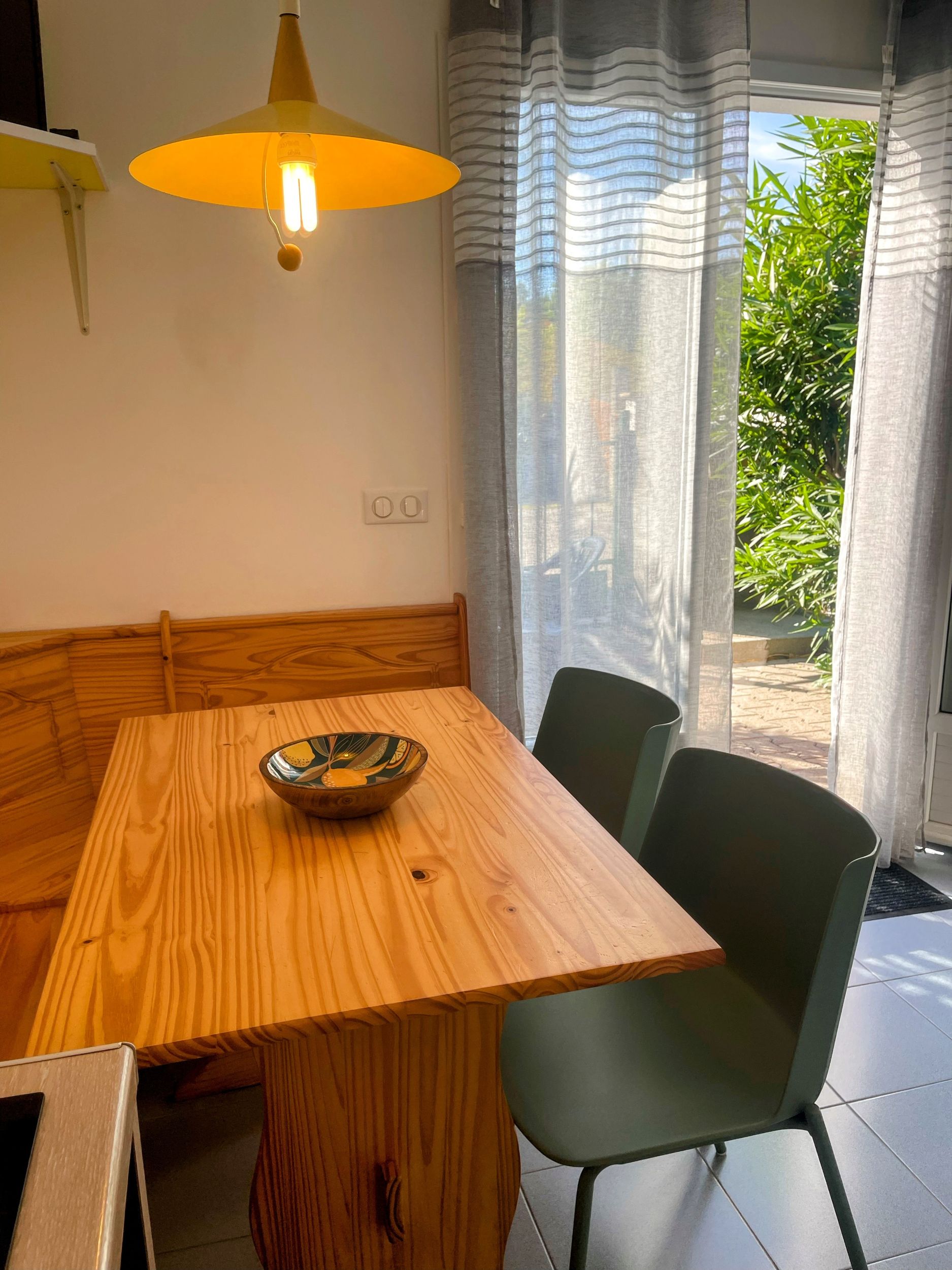 Aux beaux jours, vous vivez dedans/dehors au calme sur une terrasse fleurie de lauriers roses .