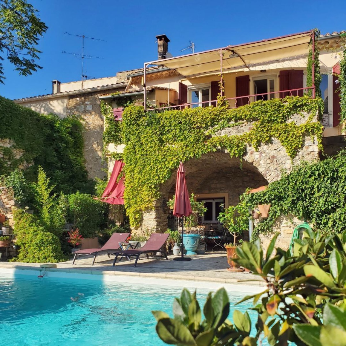 Les grandes fenêtres offrent une vue dégagée sans vis-à-vis, sur le jardin. Vous pourrez profiter des coins ombragés pour vous détendre et jouir d’une terrasse privée. La grande piscine extérieure, commune aux propriétaire et à un autre hébergement, est entourée de chaises longues et de parasols pour profiter du soleil.