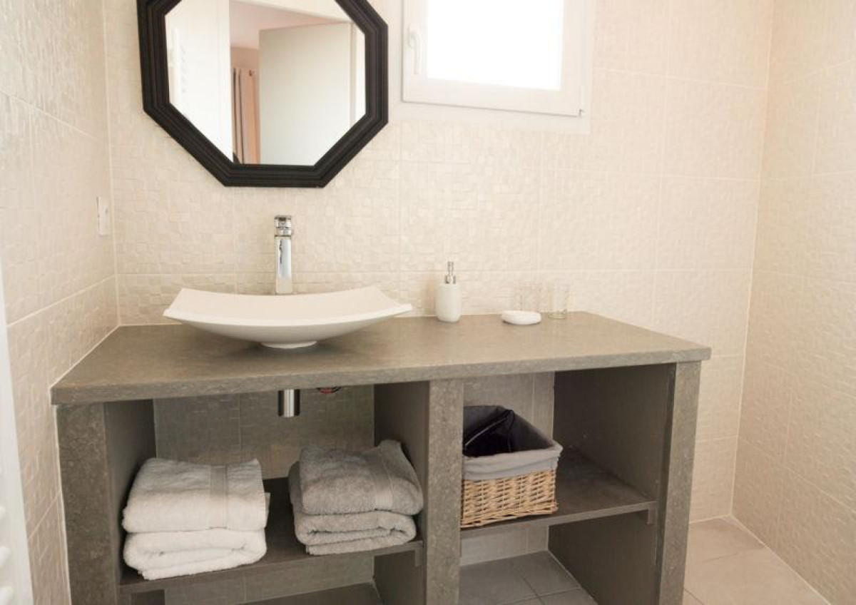 • Chambre 1 – Rez-de-chaussée : lit 160×200 cm, salle d’eau privative, toilettes séparées, télévision, terrasse et salon de jardin privatifs.