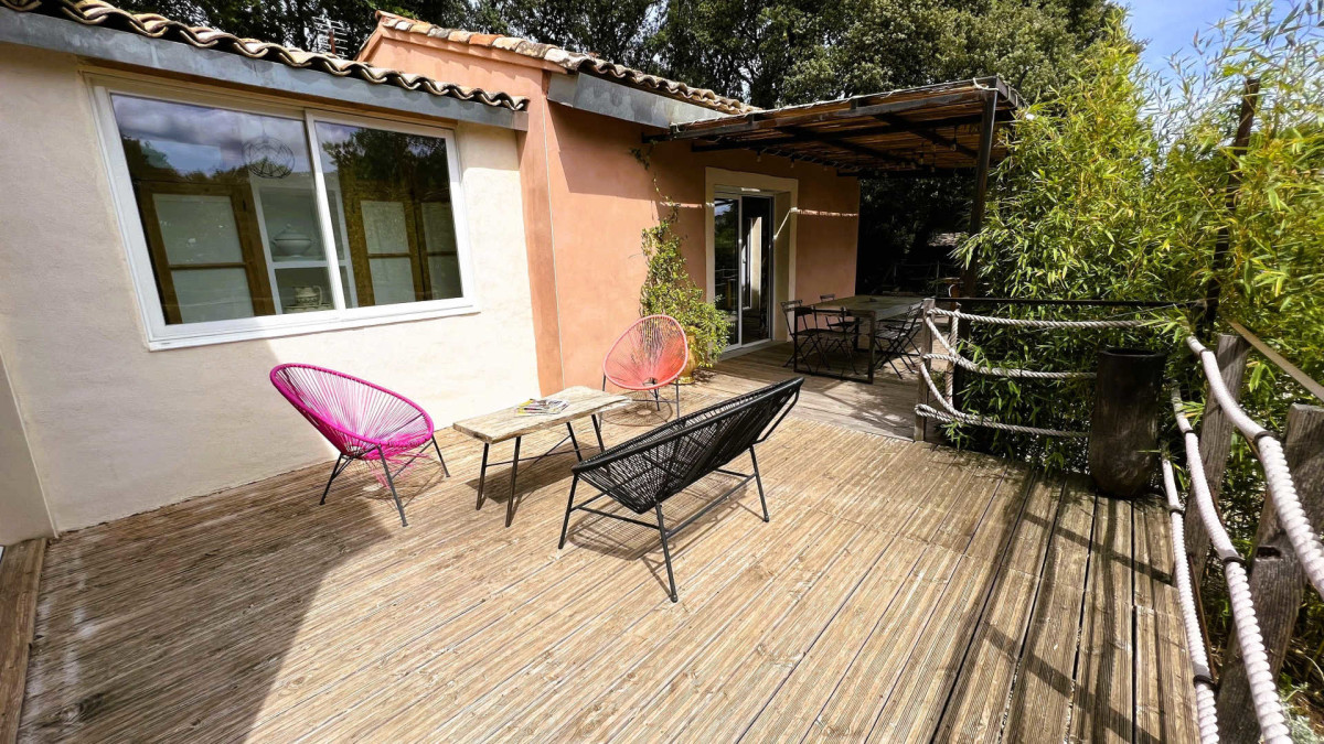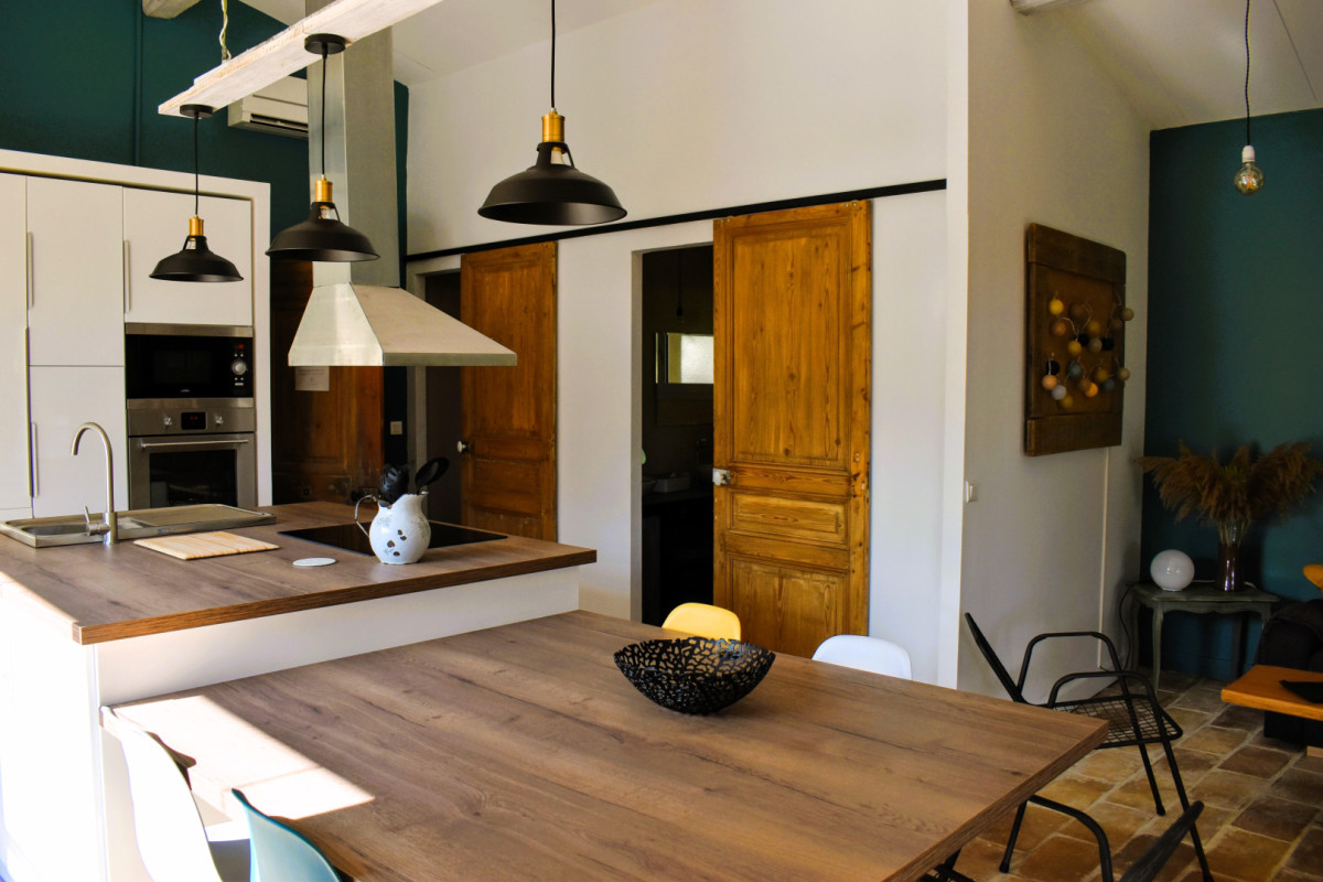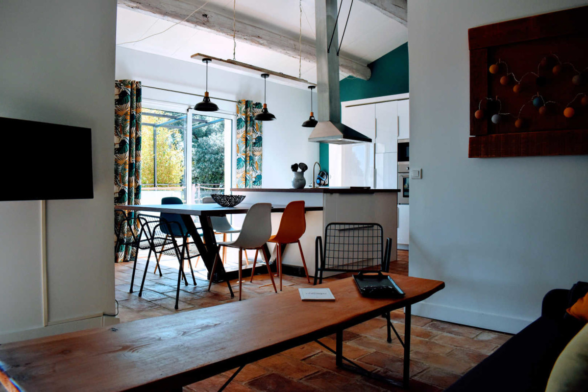 A l’intérieur, la vaste pièce à vivre de 35m² est totalement ouverte sur la terrasse de 70m2. La maison se compose d’une cuisine entièrement équipée avec coin repas et espace salon. De trois chambres (deux au rez-de-chaussée et la troisième à l’étage) avec un lit en 180×200, un lit en 140×200 et 2 lits en 90×200 et deux salles d’eau et deux WC séparés complètent l’espace de vie. Elle est décorée avec goût dans l’alliance harmonieuse de matériaux anciens et d’équipements modernes