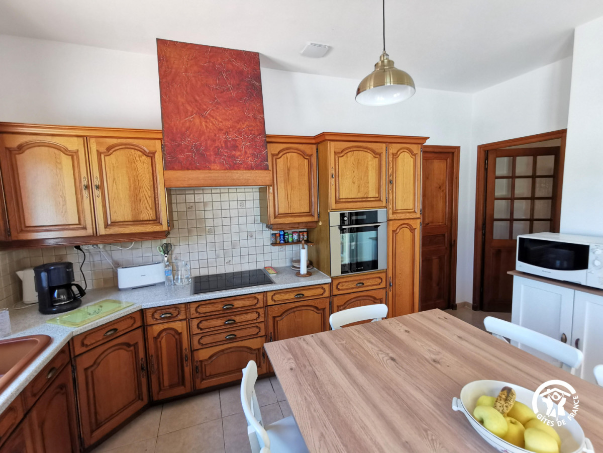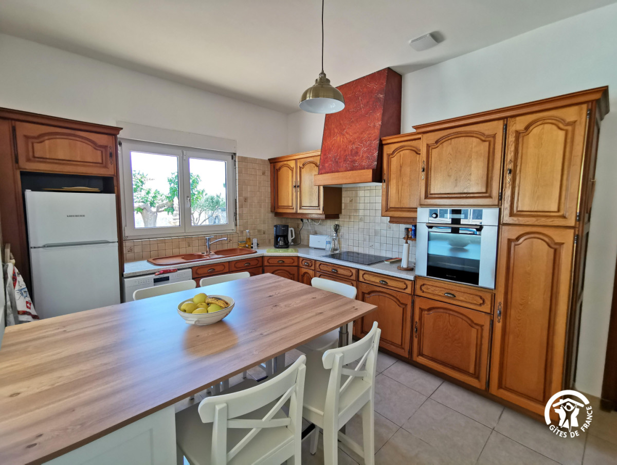 Maison mitoyenne de 125m2 avec cuisine toute équipée: four, micro-ondes, réfrigérateur avec congélateur, lave-vaisselle, machine à café et tout le nécessaire de cuisine.