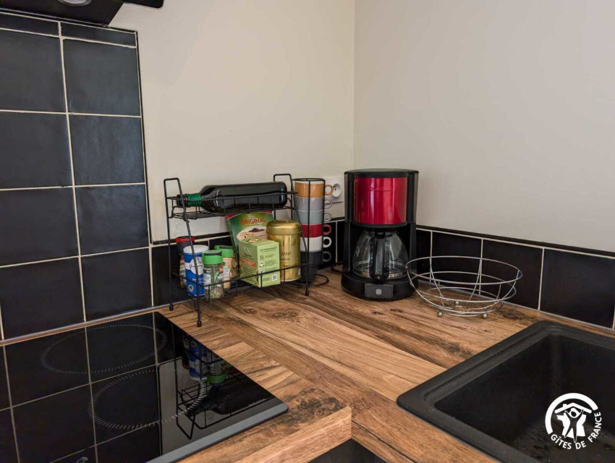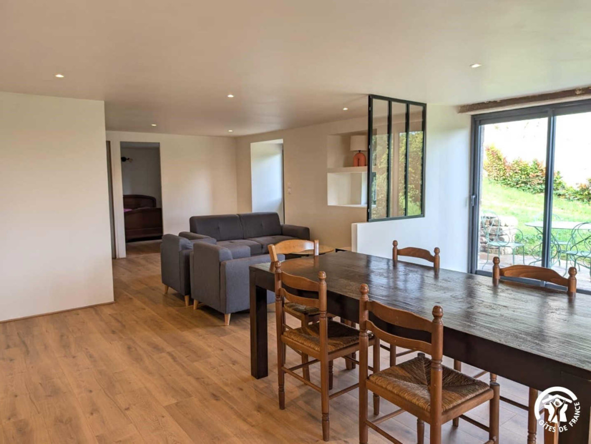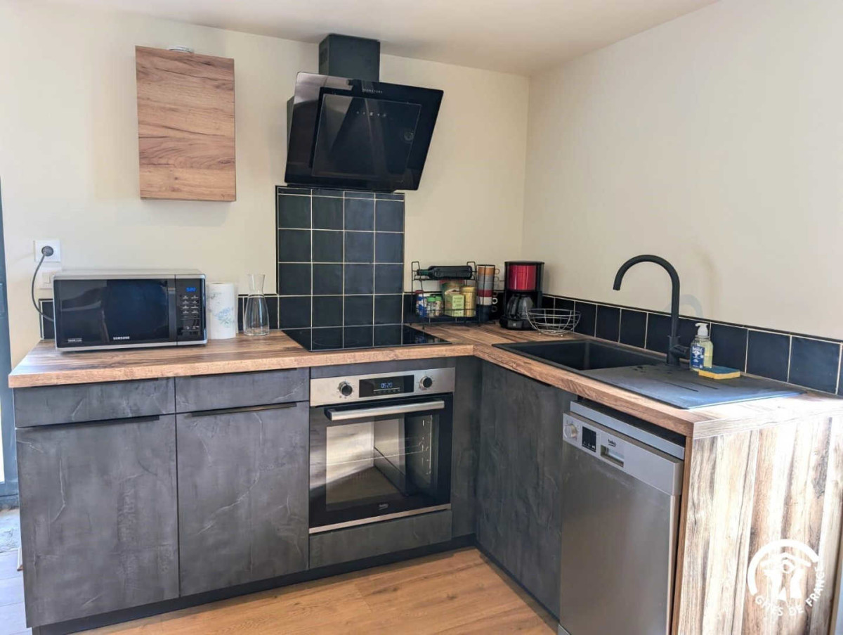– Une pièce de vie délimitée en un espace salon avec canapé et table basse, et un espace repas avec la cuisine équipée (four, micro-ondes, cafetière filtre, lave-vaisselle) et la table à manger.