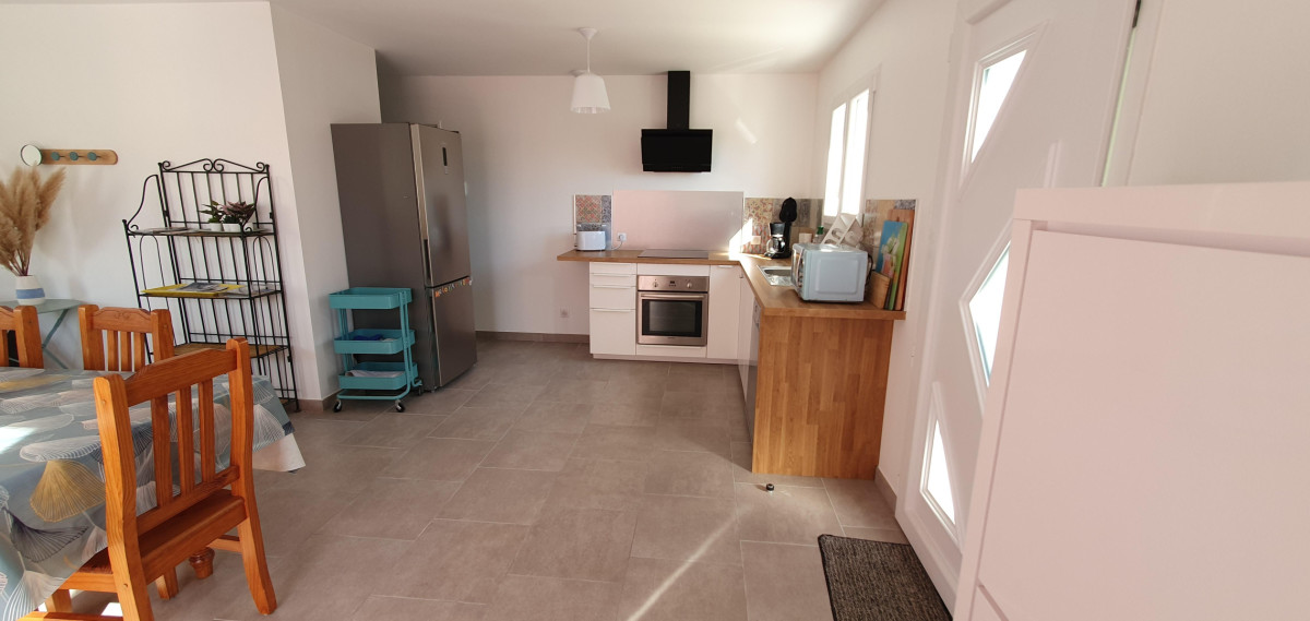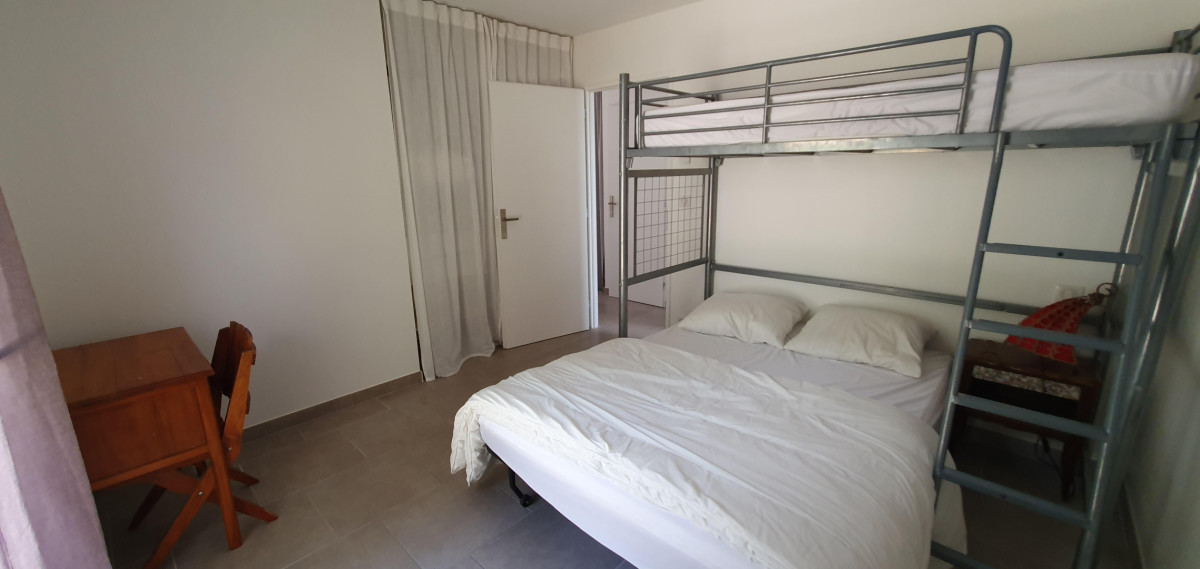 La première chambre dispose d’un lit en 160x200cm, de nombreux rangements et un accès sur le jardin. La deuxième chambre dispose également d’un accès sur l’extérieur, d’un lit double en 140x190cm et d’un lit en 90x190cm en superposé.