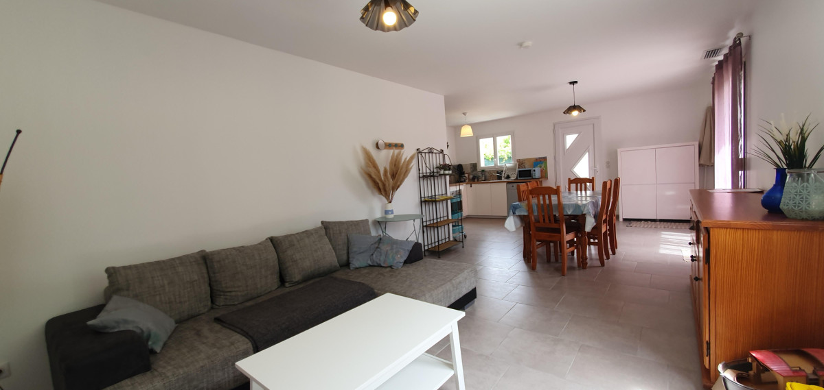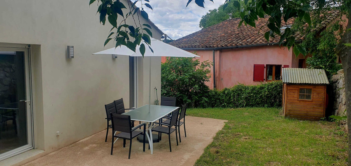 A l’arrière de la maison vous pourrez profiter d’un jardin non clos gazonné (peu adapté aux chiens), avec sa terrasse et son barbecue.