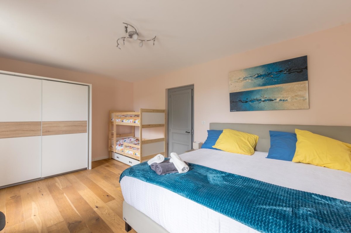– Une première chambre « parentale » avec un lit king size 200x200cm ainsi que deux lits superposés (adapté aux enfants jusqu’à 8-10 ans) ;