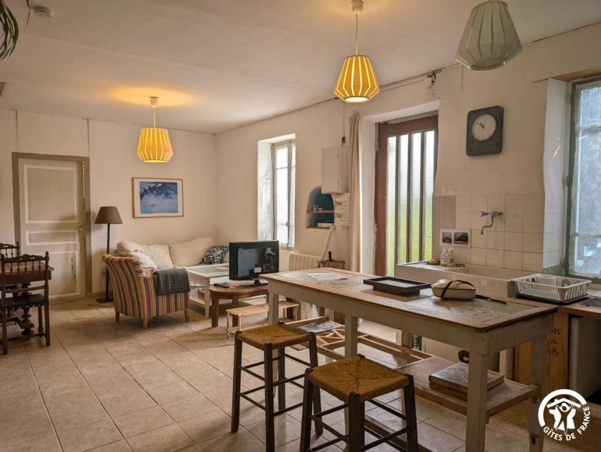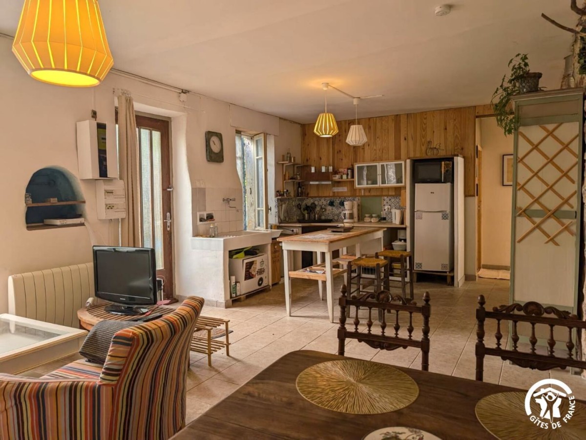 – Un séjour/cuisine avec table à manger, canapé, cuisine équipée (four, four micro-onde, 2 plaques de cuisson électriques, cafetière à filtre, lave-vaisselle 6 couverts, autocuiseur, …).