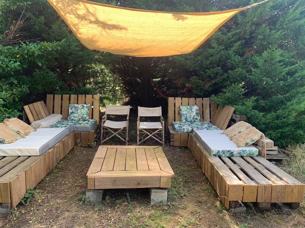 Grand jardin (clos) de 1800m2 avec un espace jeux (balançoire et table de ping-pong), une terrasse sous pergola où manger à l’ombre, un barbecue, un coin détente avec transats et banquettes.