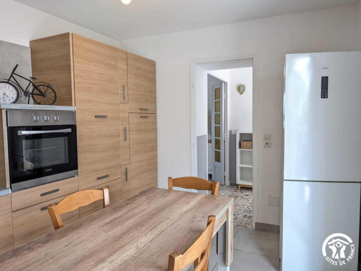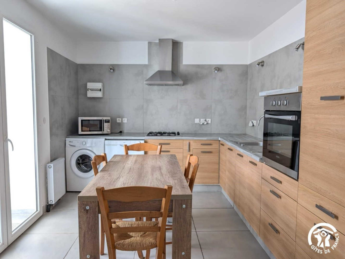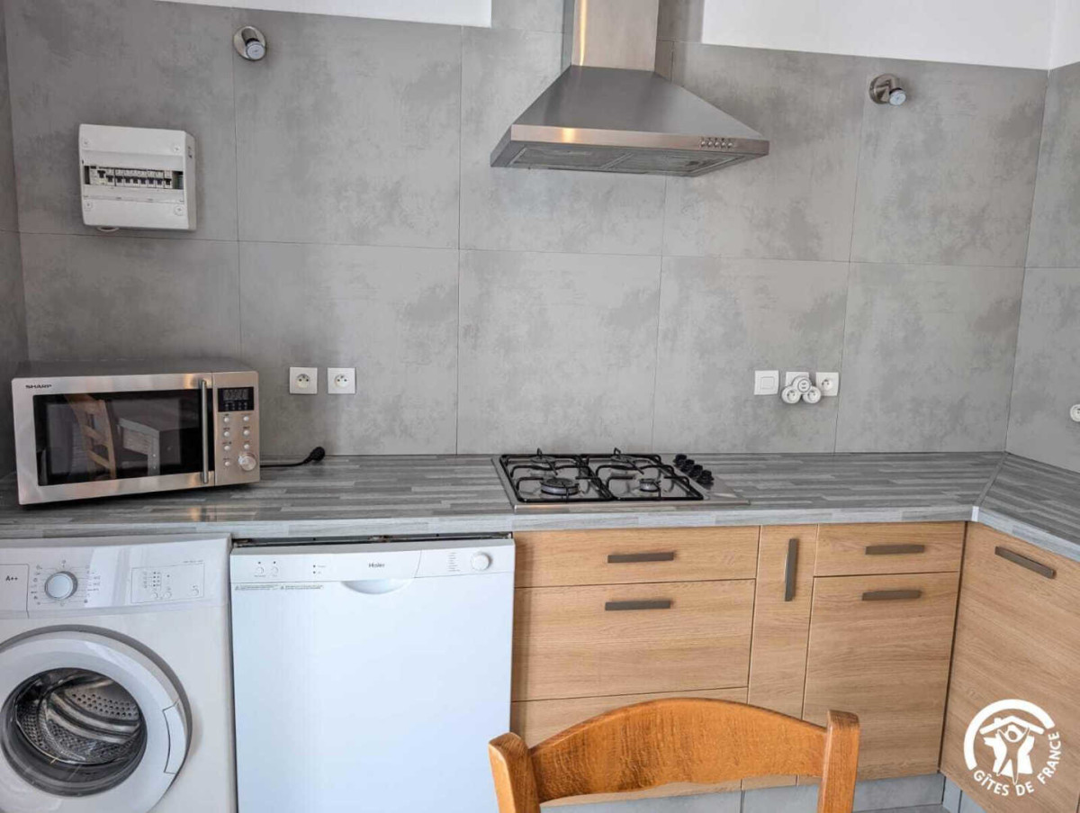– Cuisine équipée avec table à manger. Réfrigérateur-congélateur, four, lave-vaisselle, micro-ondes, cafetière, bouilloire, grille-pain, lave-linge…