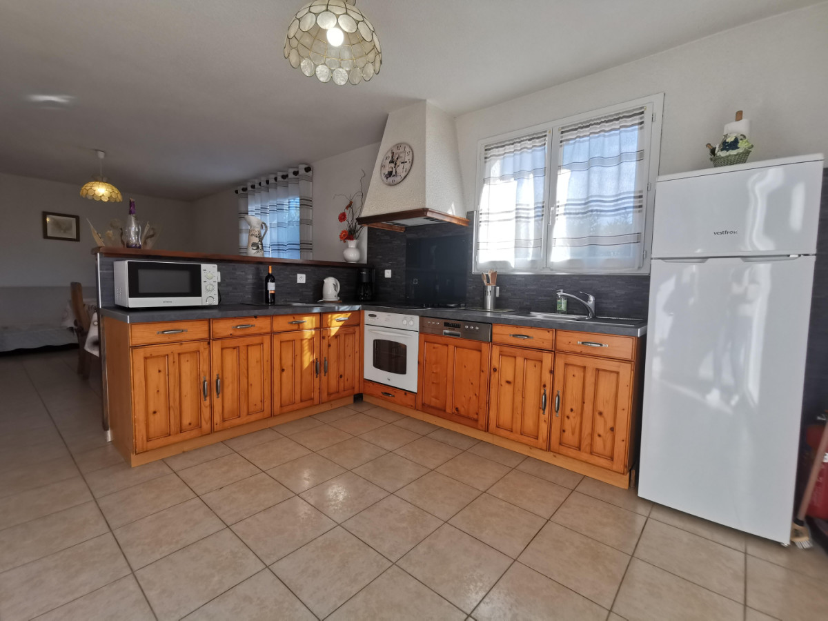 – Un séjour lumineux avec canapé, TV et cuisine ouverte entièrement équipée (four, micro-ondes, plaques de cuisson, réfrigérateur, etc.)