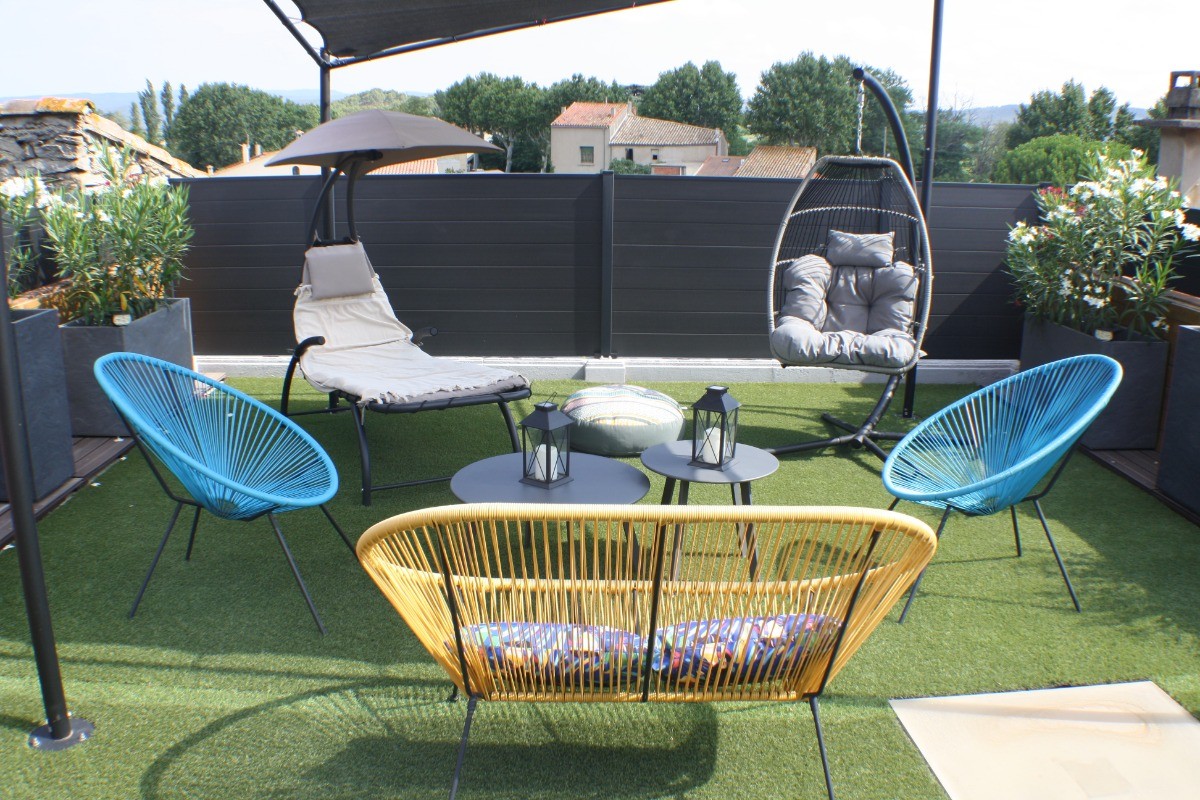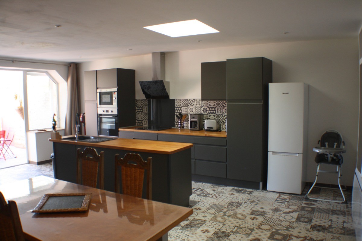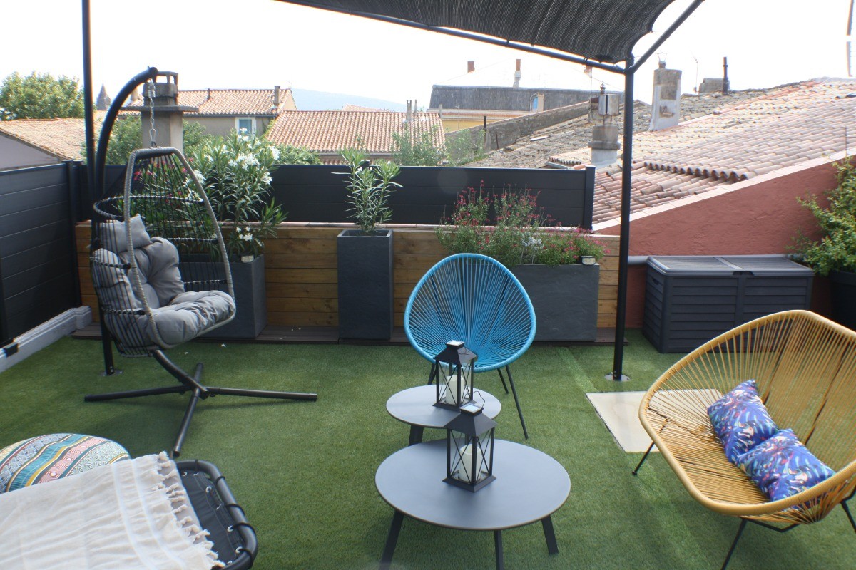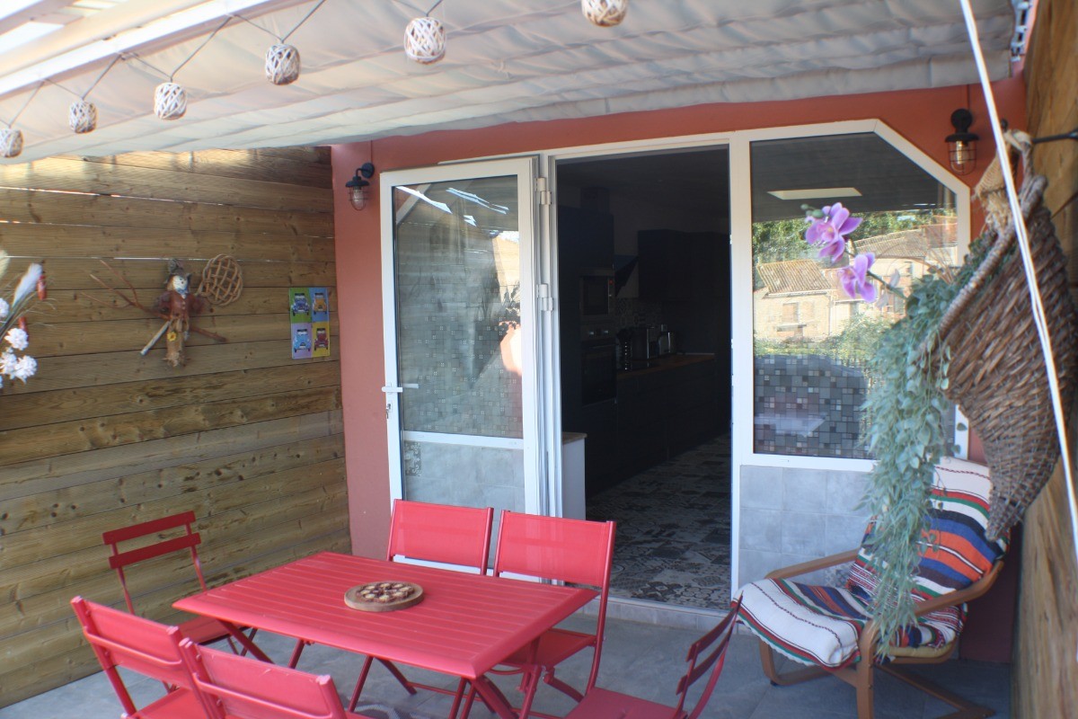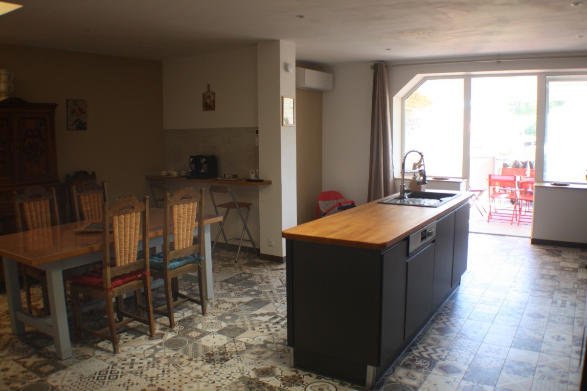 La cuisine ouverte, véritable cœur de la maison, est entièrement équipée avec des appareils modernes tels qu’un four, un congélateur, un micro-ondes, une double machine à expresso et un lave-vaisselle. Une seconde télévision y est également présente. Cette pièce lumineuse s’ouvre sur une première terrasse intime, aménagée avec une table de jardin et une plancha, idéale pour des repas en plein air sous le doux climat occitan.