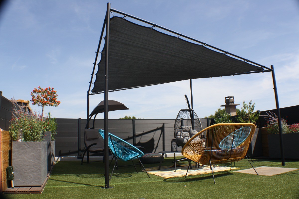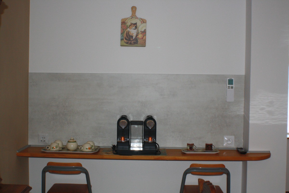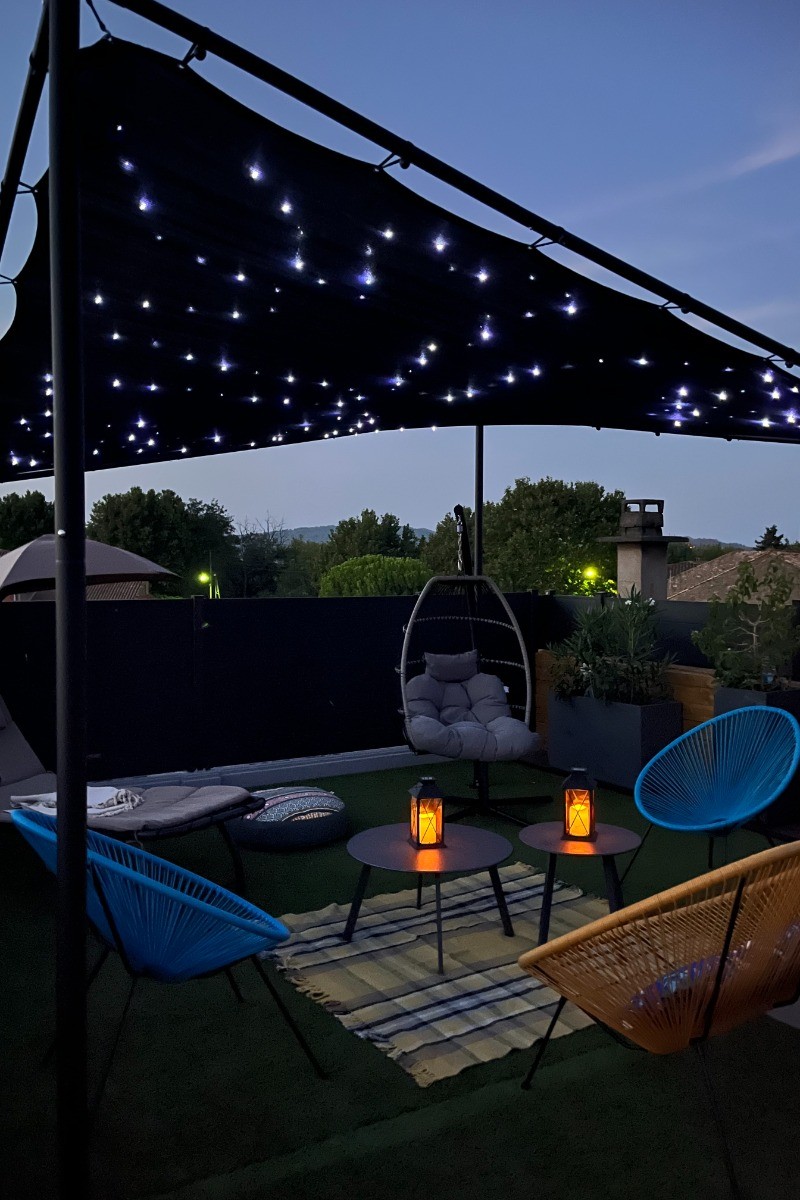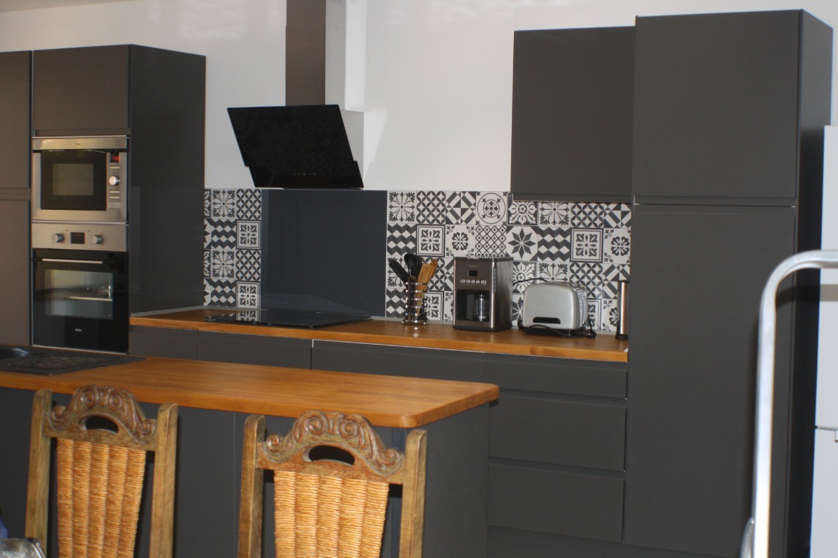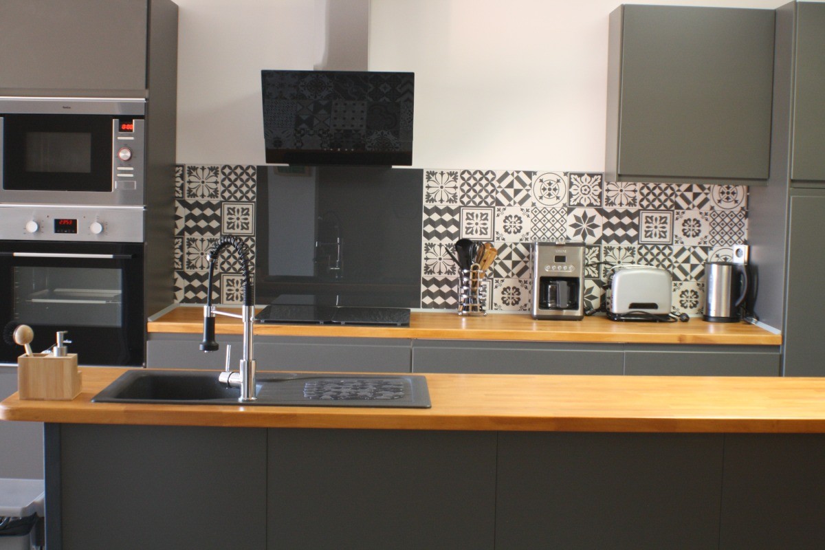 La cuisine ouverte, véritable cœur de la maison, est entièrement équipée avec des appareils modernes tels qu’un four, un congélateur, un micro-ondes, une double machine à expresso et un lave-vaisselle. Une seconde télévision y est également présente. Cette pièce lumineuse s’ouvre sur une première terrasse intime, aménagée avec une table de jardin et une plancha, idéale pour des repas en plein air sous le doux climat occitan.