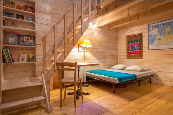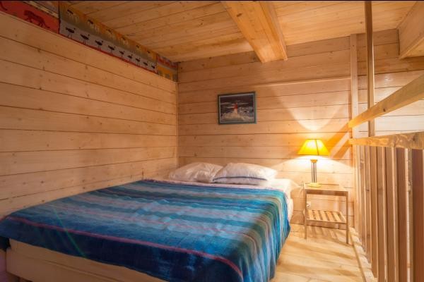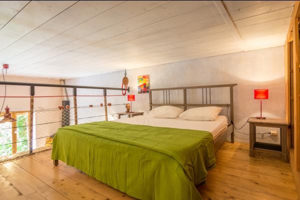 Au dessus du séjour une mezzanine surplombant cette pièce de vie. C’est un coin nuit avec une lit en 160 cm ( attention hauteur inférieure à 1.60m)
