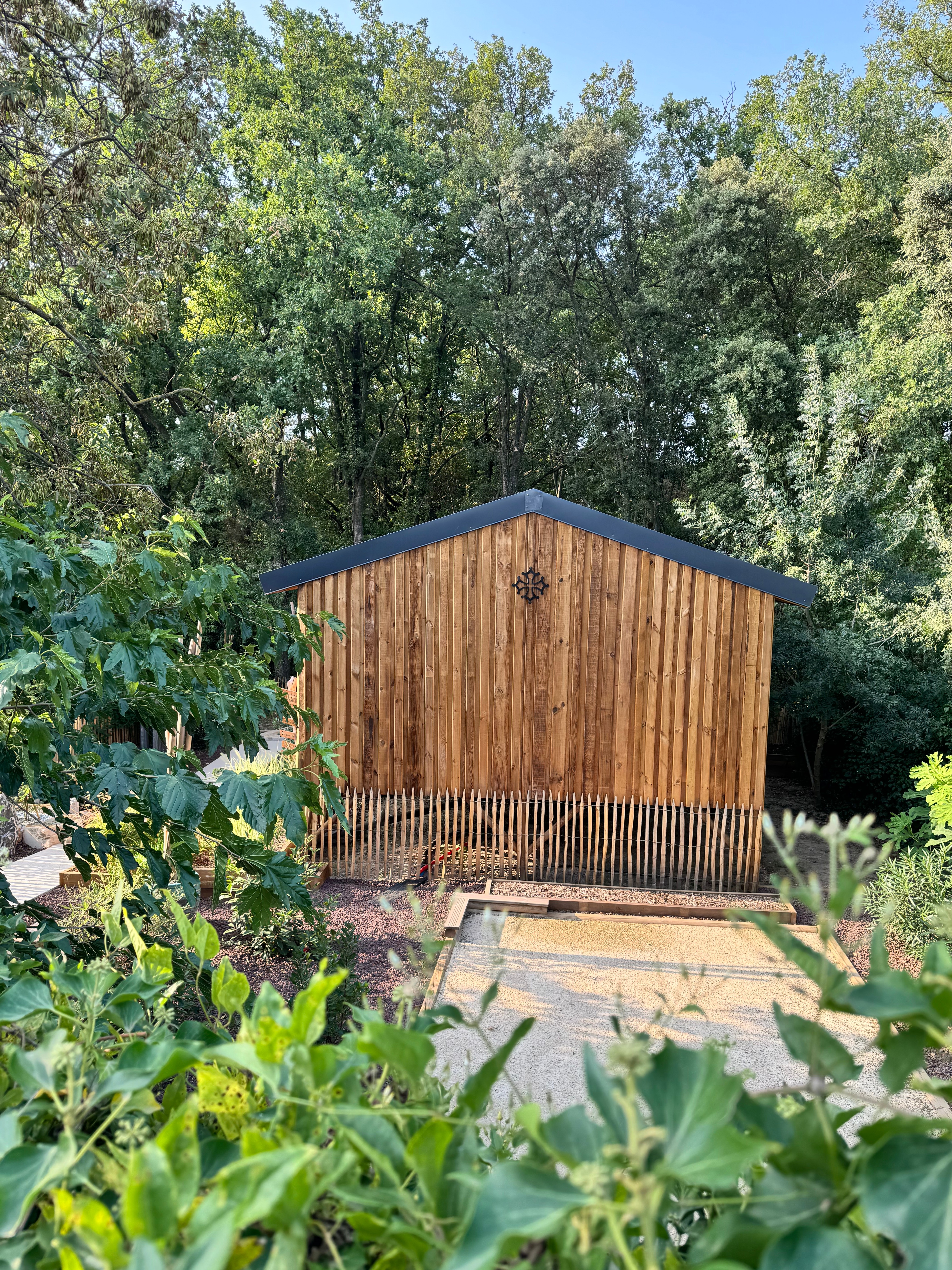 Derrière la cabane en bois se trouve un terrain de pétanque équipé de boules vous attend pour vos moments conviviaux