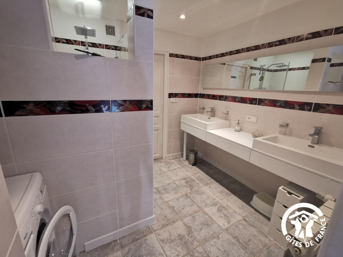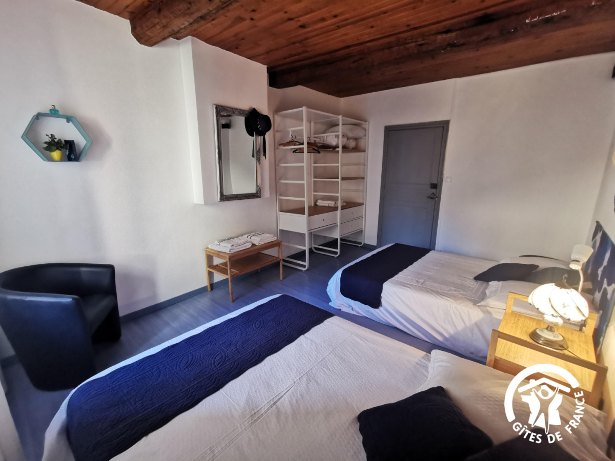 La chambre se trouve au premier étage (2 lits 140×190) avec la salle de bain.