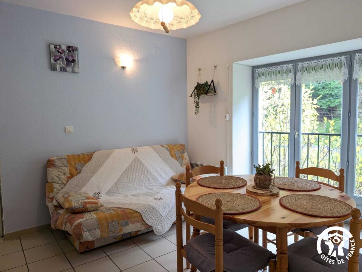 Le gîte de 36m2, accessible par quelques marche à l’entrée, est composé d’un coin-cuisine dans le séjour, 1 chambre avec 1 lit 2 pers, une salle de bains et wc.
