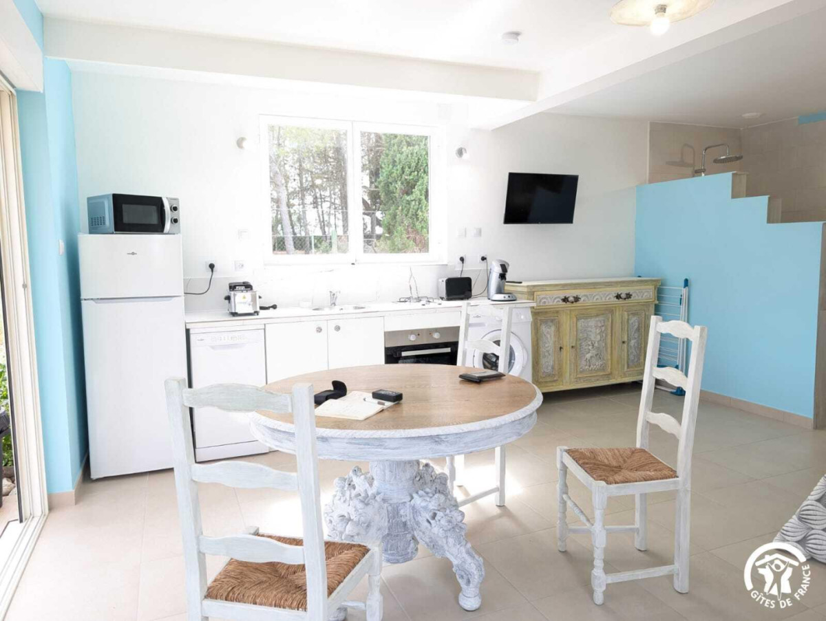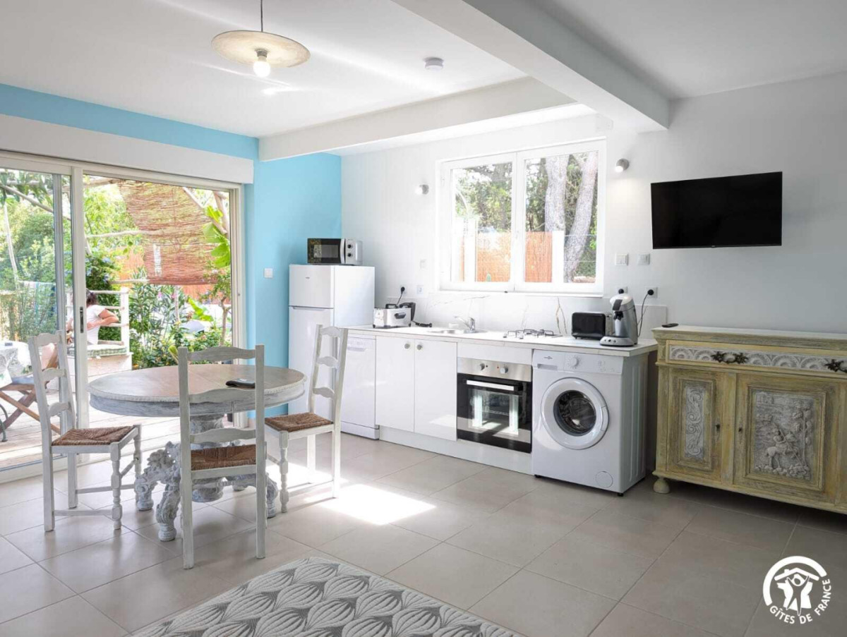 – Cuisine équipée avec table à manger. Réfrigérateur-congélateur, four, lave-vaisselle, micro-ondes, cafetière à dosette Senseo, grille-pain, bouilloire, lave-linge…